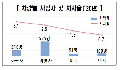 화물차·버스 등 사업용 차량 등록대수는 전체 자동차의 7%에 불과하지만, 사망자는 20% 수준, 화물차는 치사율이 매우 높아 대형사고 발생 위험이 높음.