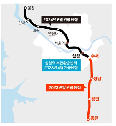 GTX-A노선은 서울 출퇴근 수요가 가장 많은 서북부와 동남권을 대각선으로 연결하는 알짜노선으로 2019년 공사를 시작해 2024년에 공사가 마무리될 예정이었다. 하지만 삼성역 영동대로 복합개발사업이 계속 미뤄지면서 GTX-A노선 완전개통이 2028년으로 밀려났다.