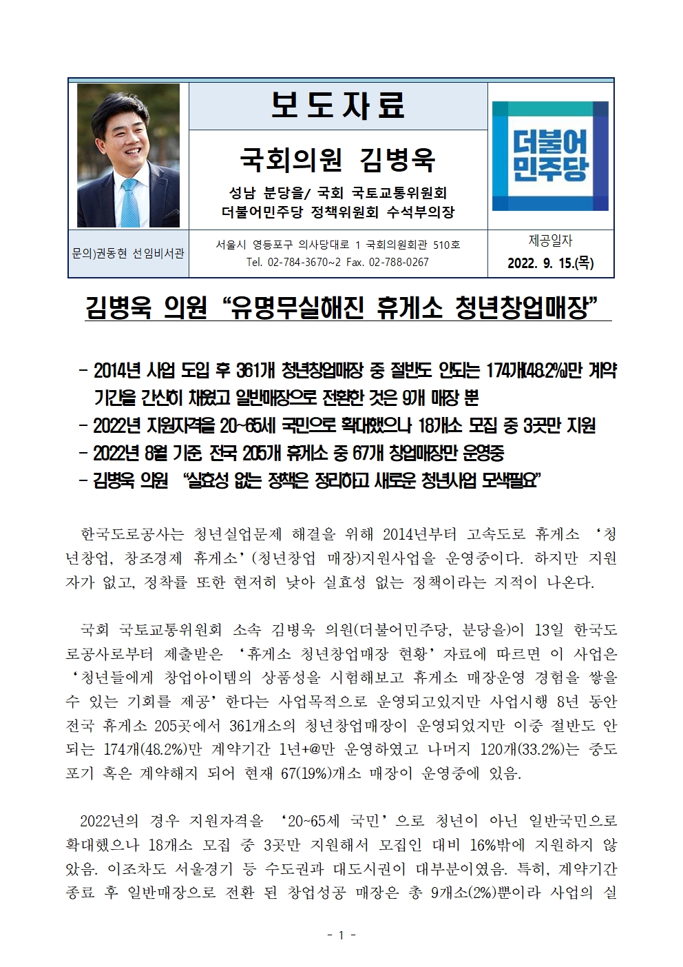 보도자료_220915_김병욱의원_유명무실_고속도로휴게소_청년창업매장.hwp