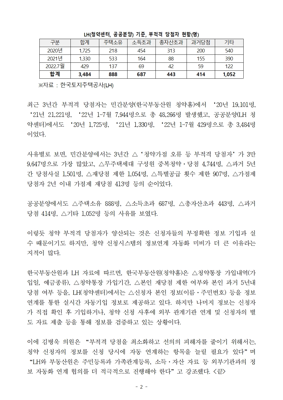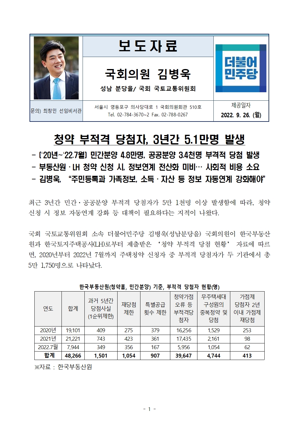 [국감보도자료] 김병욱 의원 "청약 부적격 당첨자, 3년간 5.1만명 발생"