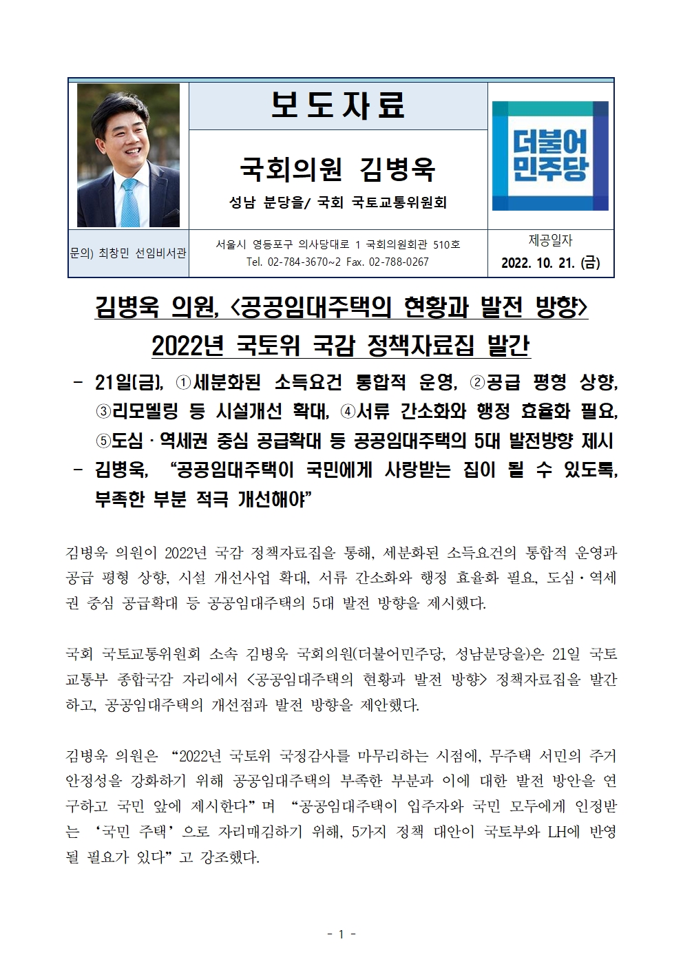 보도자료_221021_김병욱_의원,_21일_공공임대주택의_현황과_발전방향_정책자료집_발간.hwp