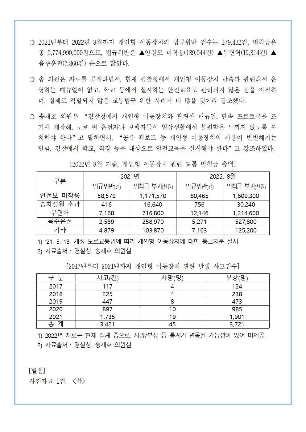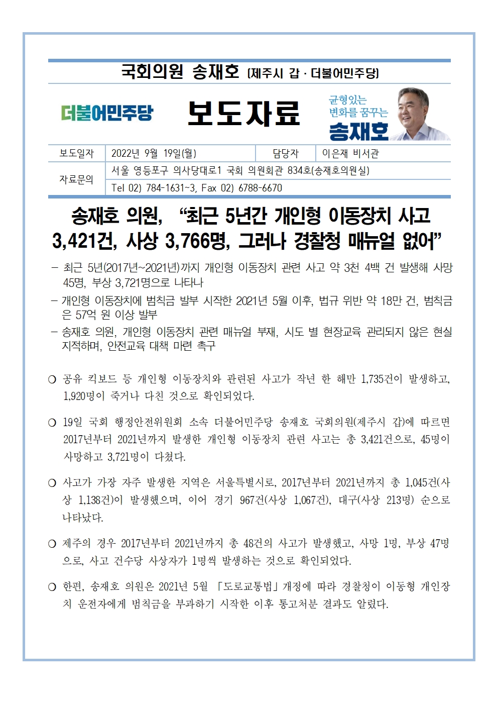 220919보도자료_송재호_의원,_“최근_5년간_개인형_이동장치_사고_3,421건,_사상_3,766명,_그러나_경찰청_매뉴얼_없어”.pdf