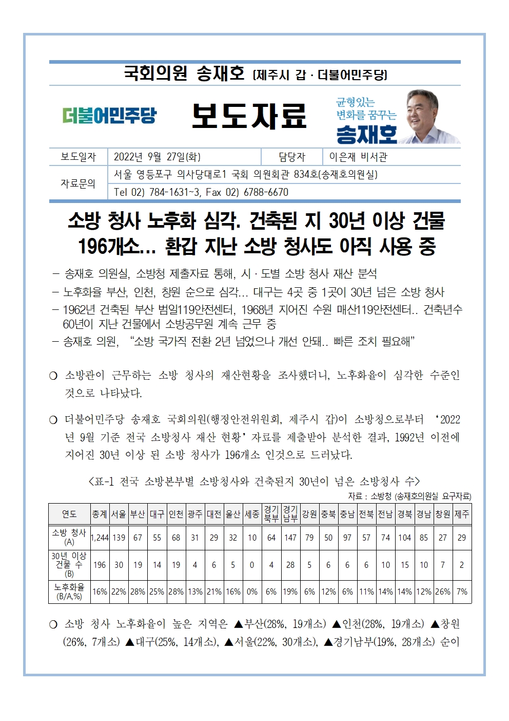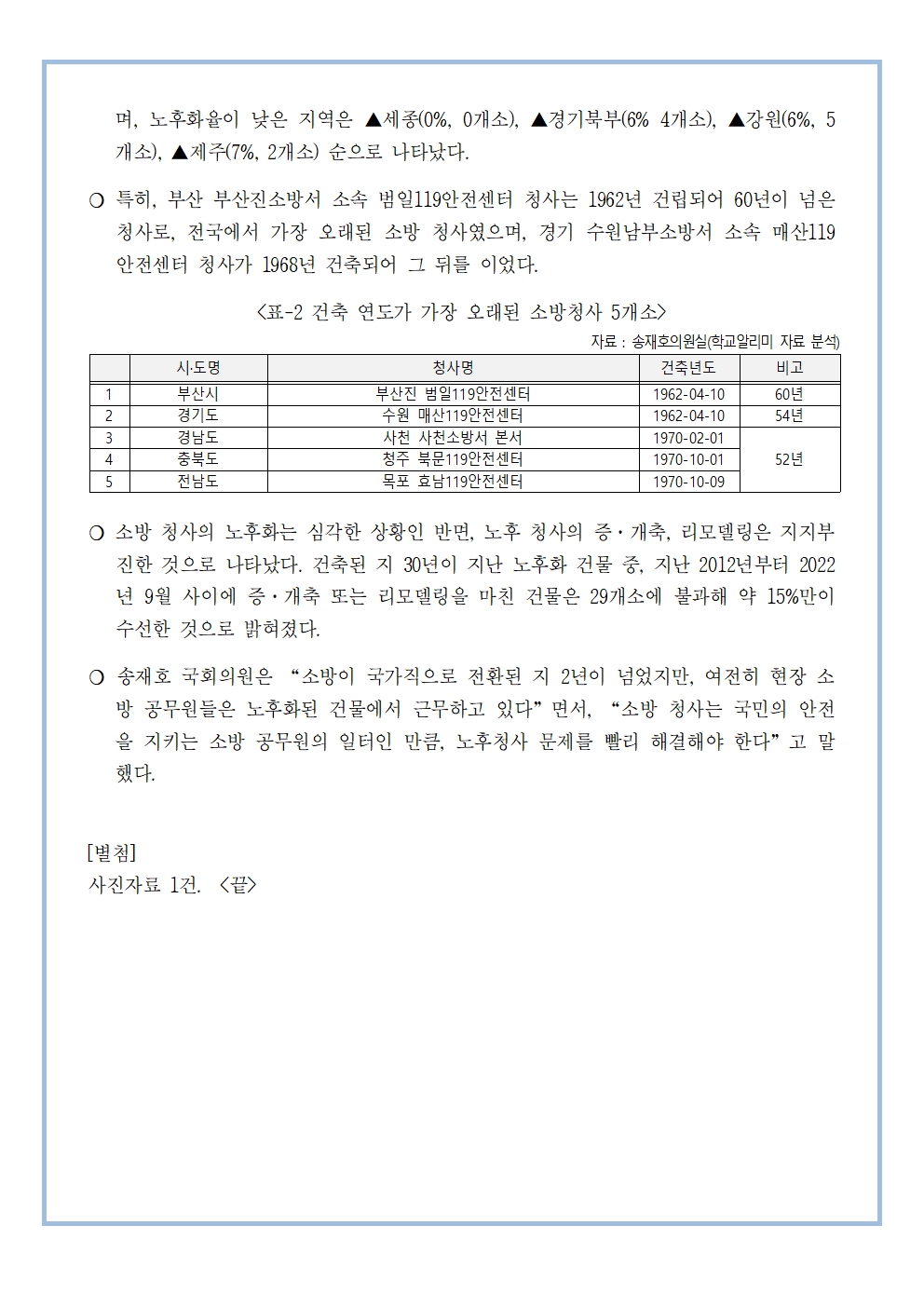 [송재호의원 국감보도자료] 소방 청사 노후화 심각. 건축된 지 30년 이상 건물 196개소... 환갑 지난 소방 청사도 아직 사용 중