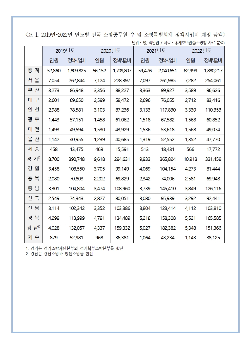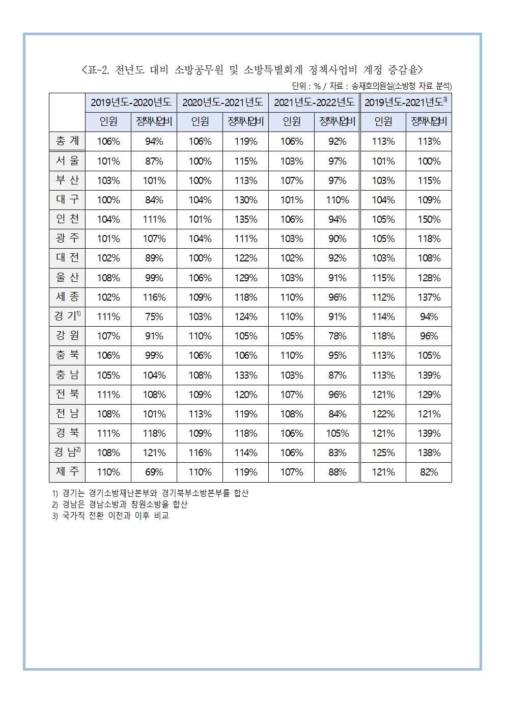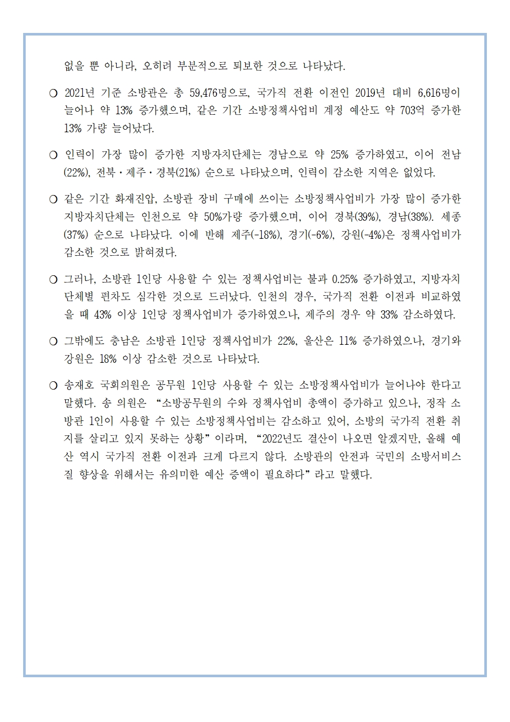 [송재호의원 국감보도자료] 소방 국가직 전환 2년 차... 그러나 지역별로 차이나는 소방안전. 우리 지역은 안전하나?