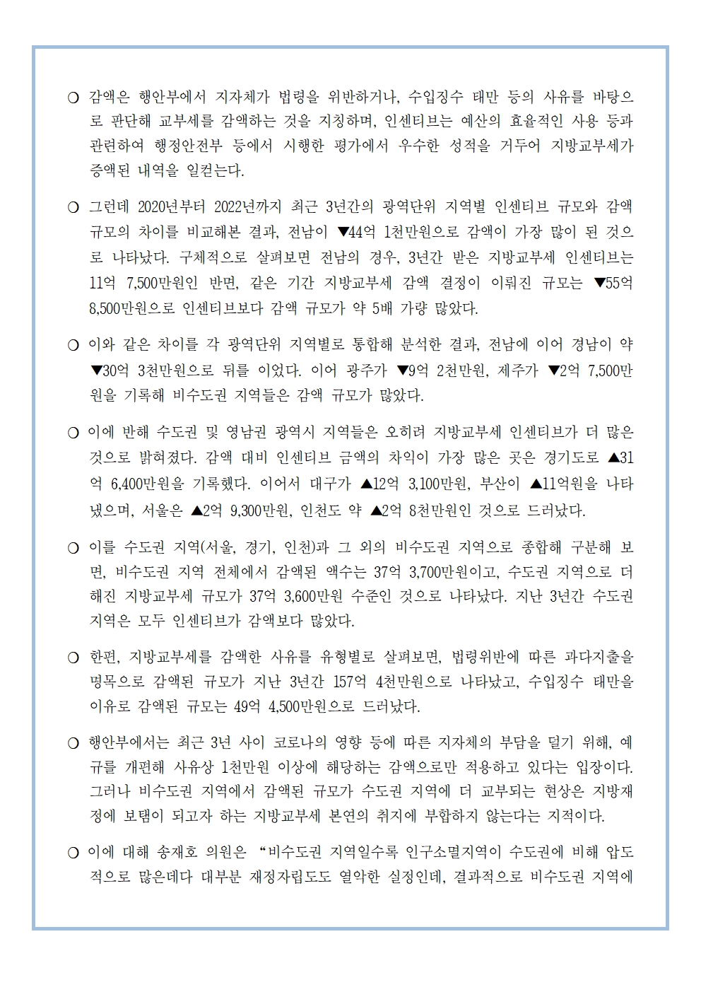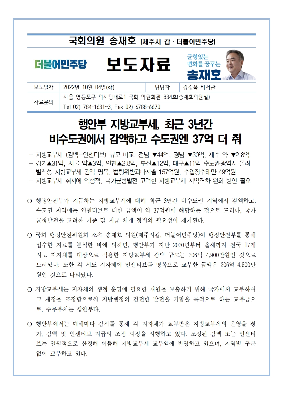 [송재호의원 국감보도자료] 행안부 지방교부세, 최근 3년간 비수도권에서 감액하고 수도권엔 37억 더 줘