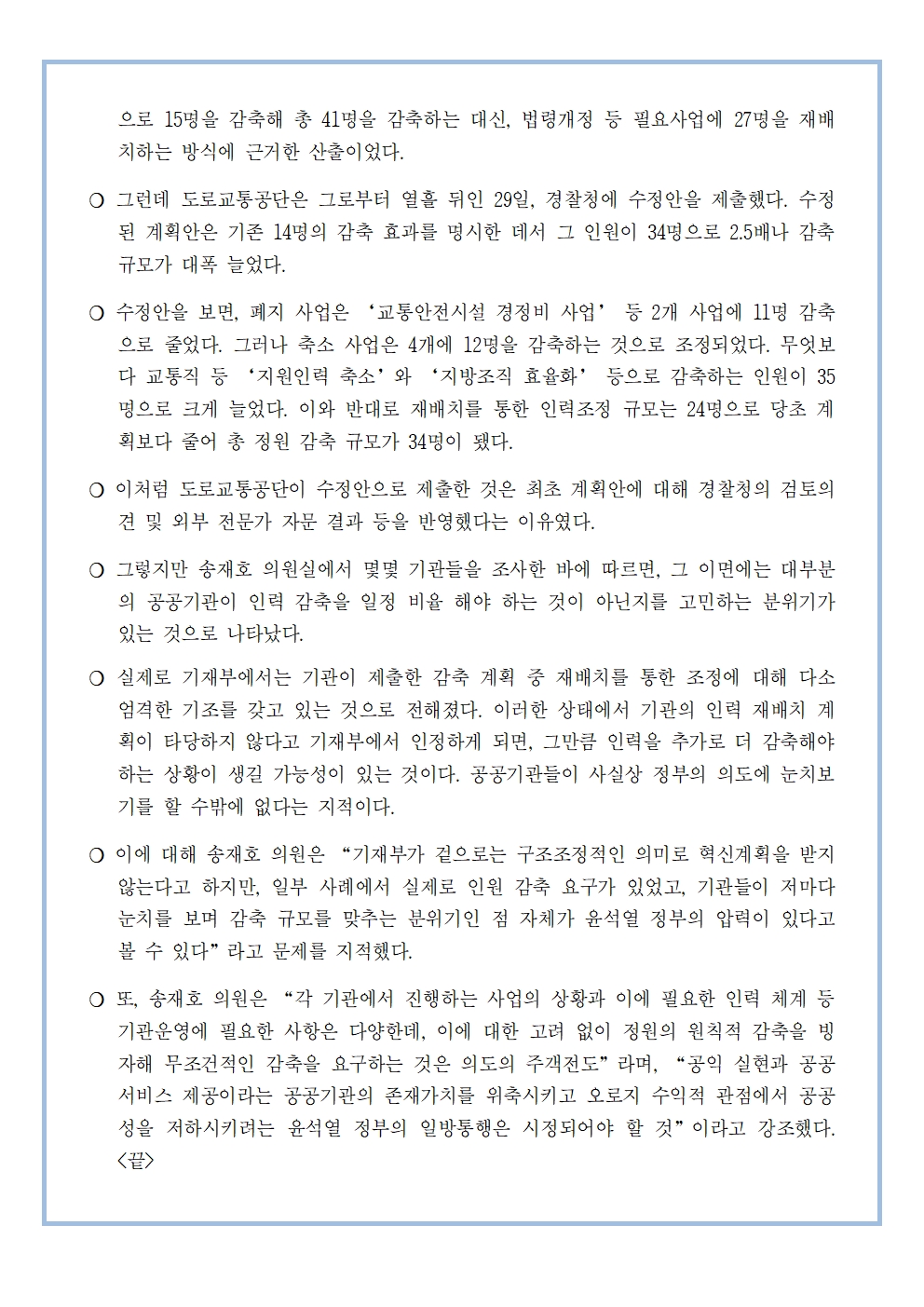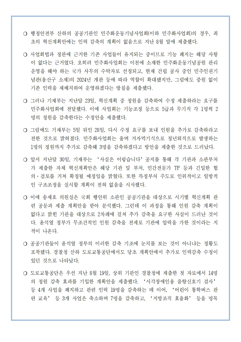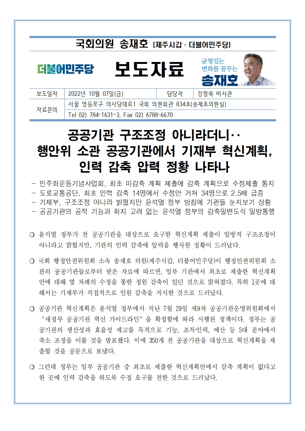 [송재호의원 국감보도자료] 공공기관 구조조정 아니라더니‥ 행안위 소관 공공기관에서 기재부 혁신계획, 인력 감축 압력 정황 나타나