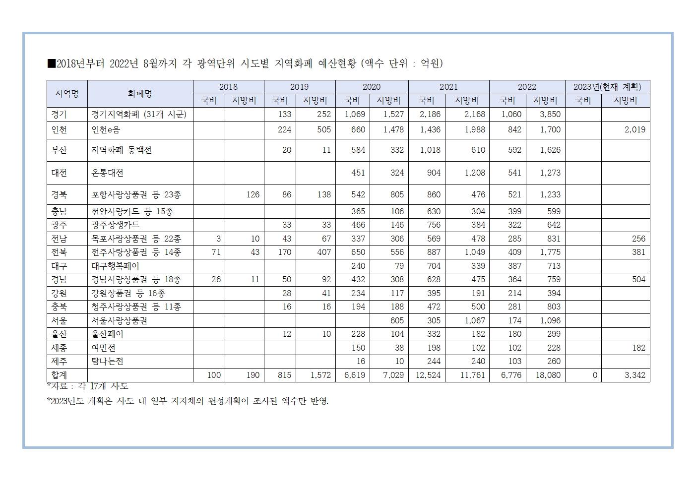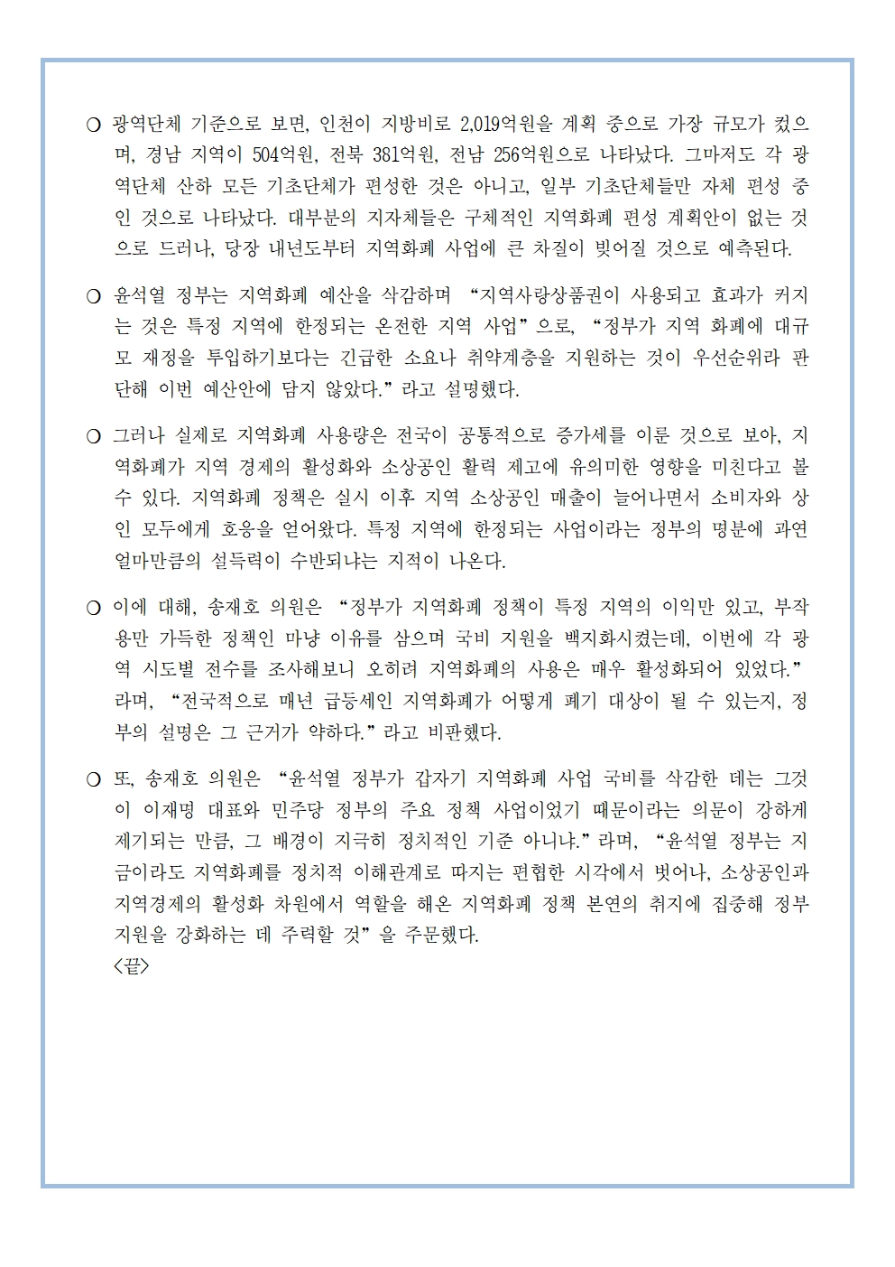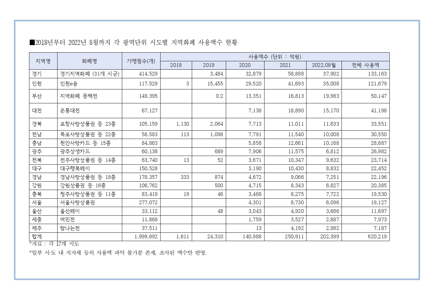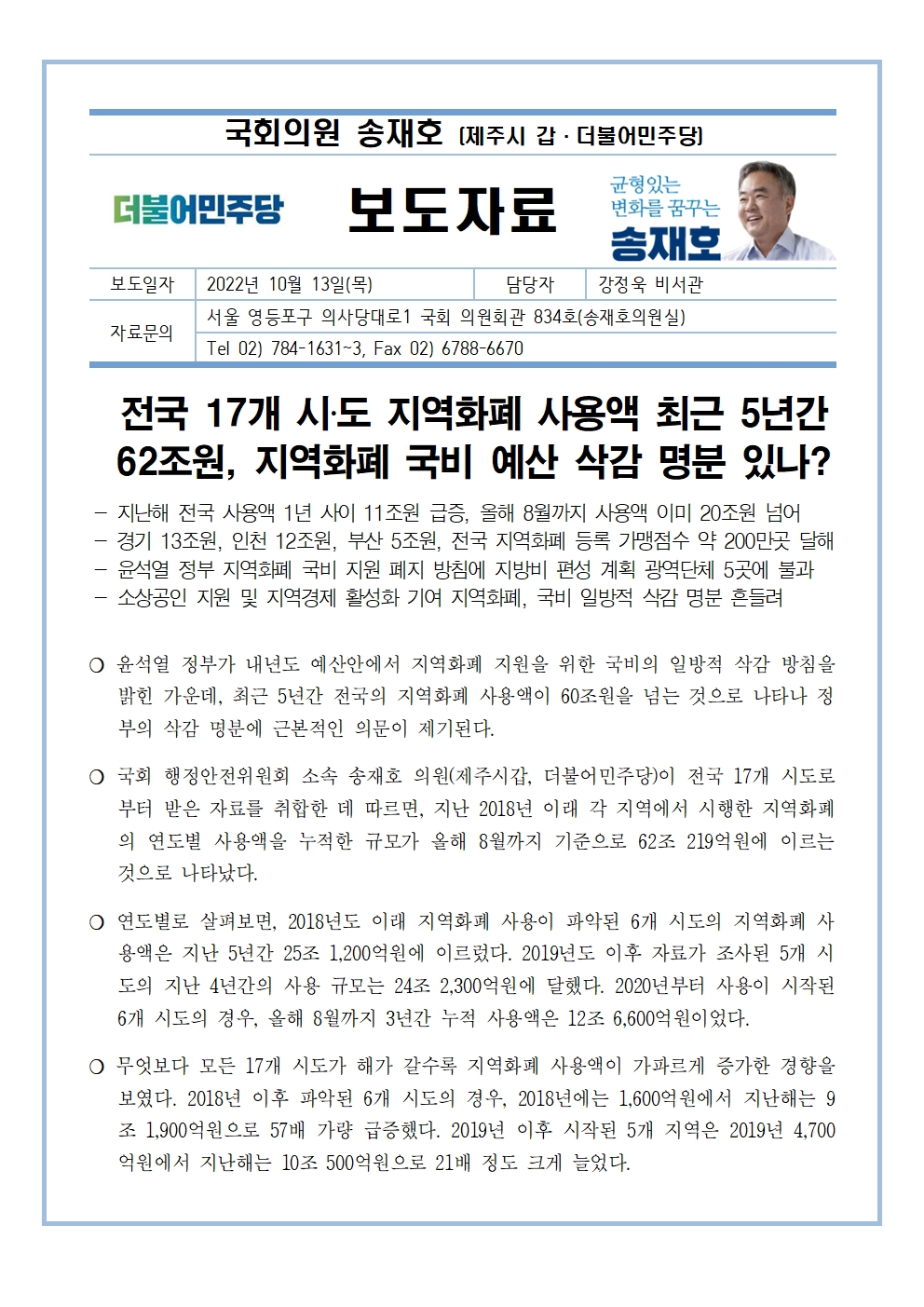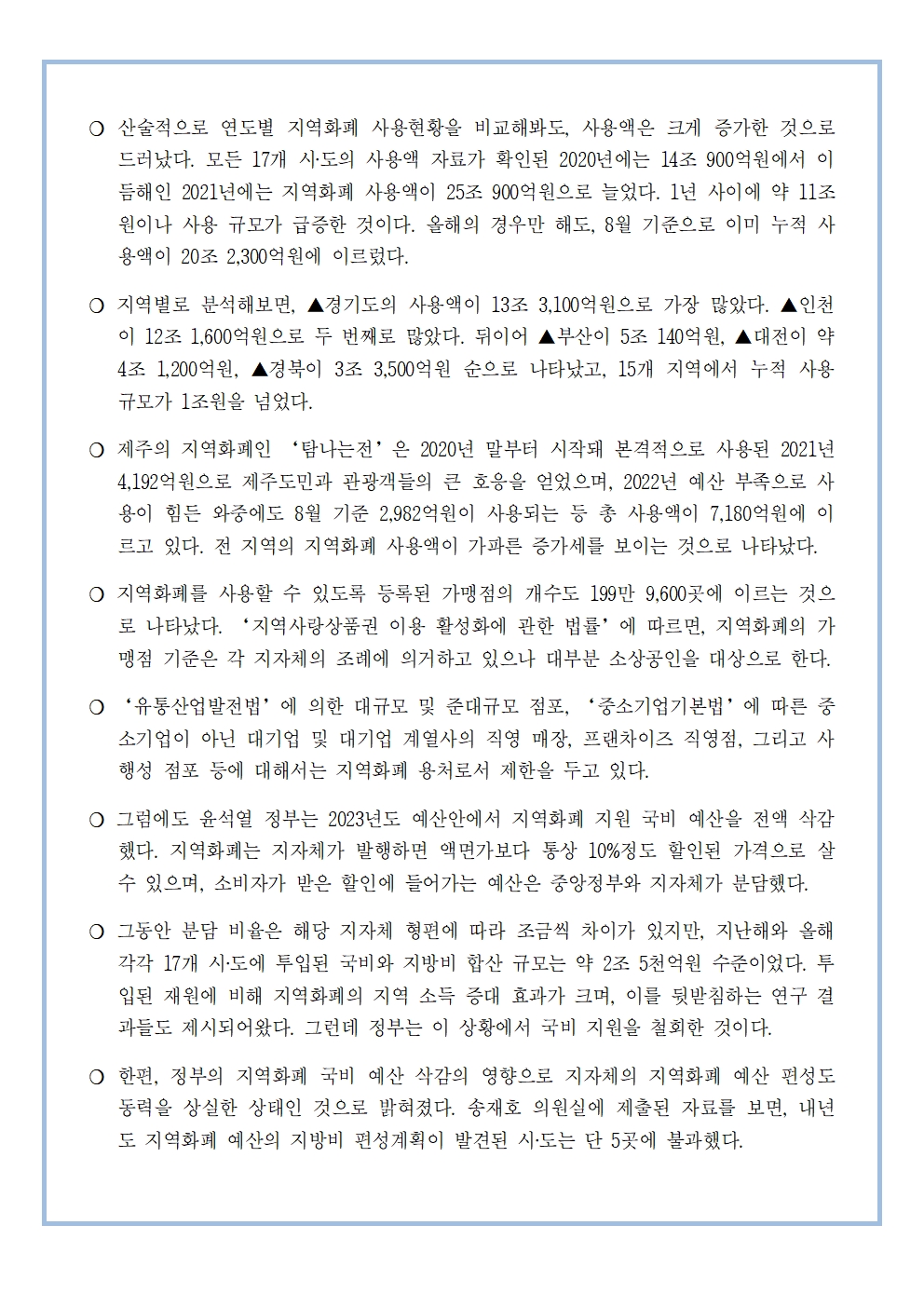 [송재호의원 국감보도자료] 전국 17개 시‧도 지역화폐 사용액 최근 5년간 62조원, 지역화폐 국비 예산 삭감 명분 있나?