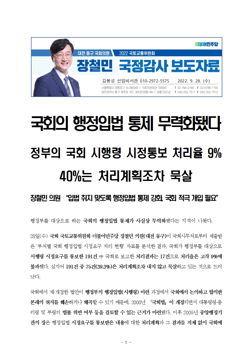 220928_장철민의원보도자료_국회의_행정입법_통제_무력화됐다.hwp