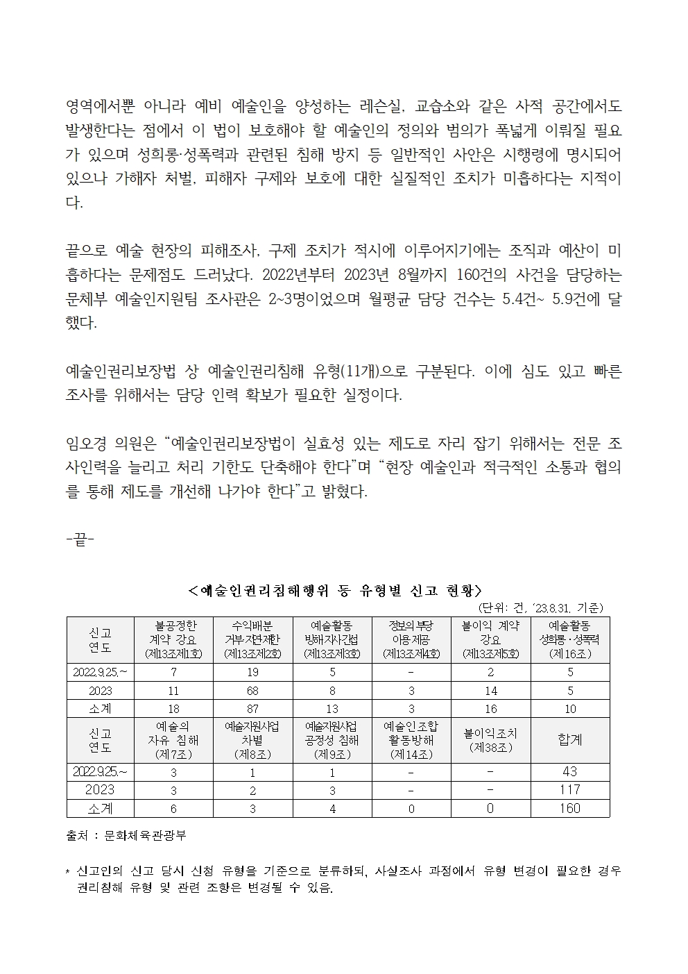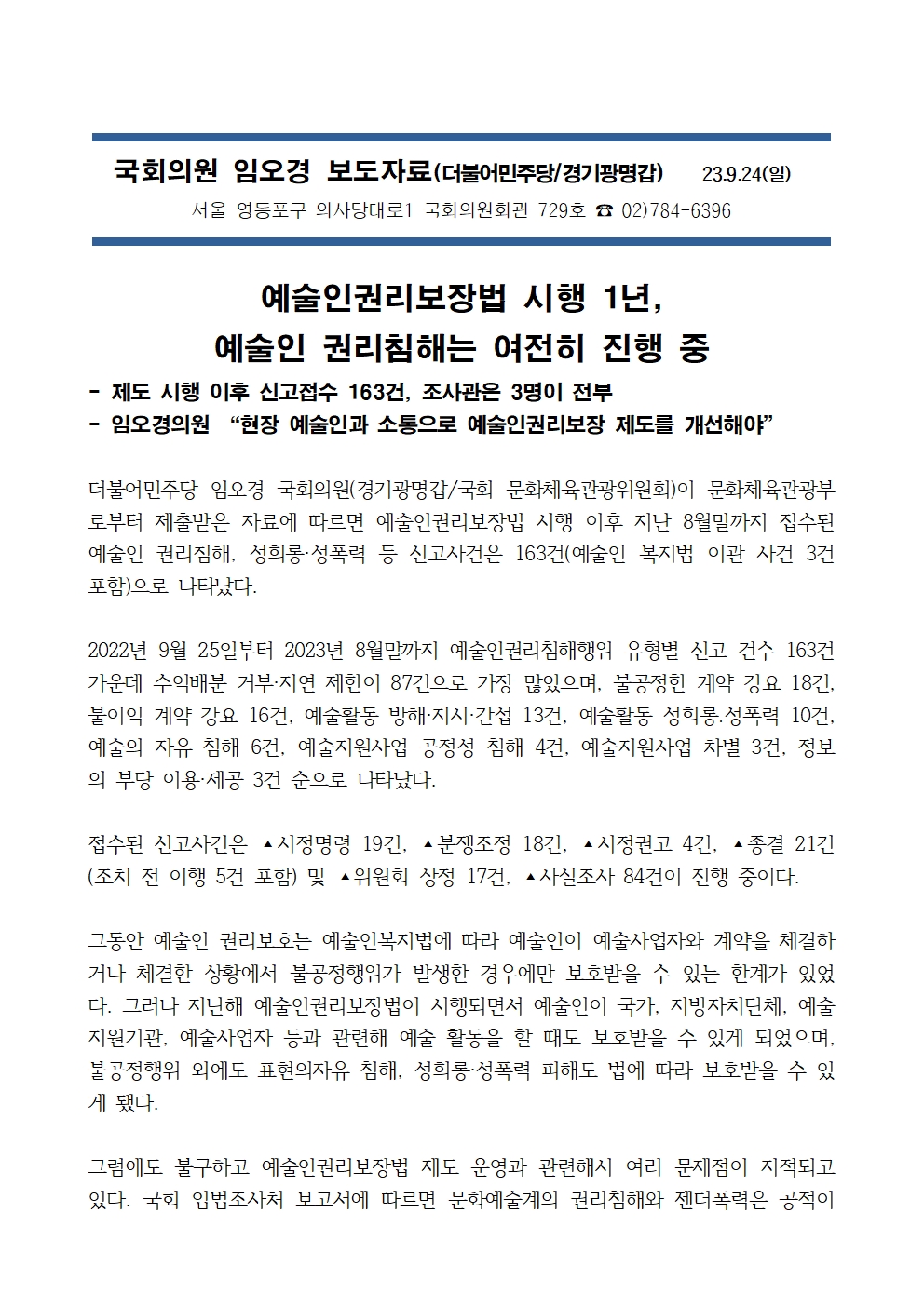 [국회의원 임오경 국감보도자료]예술인권리보장법 시행 1년, 예술인 권리침해는 여전히 진행 중
