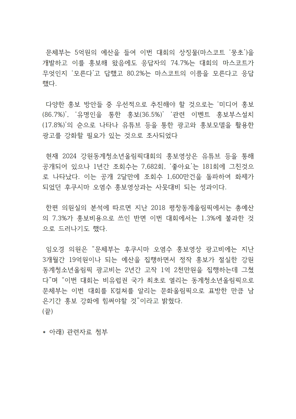 [국회의원 임오경 국감보도자료]2024 강원동계청소년올림픽 설문조사 결과 올림픽 마스코트‘뭉초’74.7% 몰라, 홍보 및 준비부족 심각