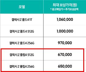 또한 한국에서는 갤럭시 Z플립4 256G의 경우 65만원을, 512G의 경우 67만원을 보하는 등 동일 모델이라 할지라도 용량에 따라 보상금액에 차등을 두고 있지만, 에서는 용량을 구분하지 않고 동일한 보상금액을 지급하고 있는 것으로 확인됐다.