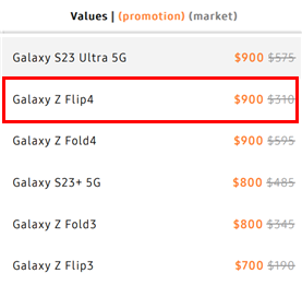 갤럭시 Z플립4 반납하고 Z플립5를 구입하는 경우에도 마찬가지로 한국에서는 67만원을 보상하는 반면, 미국에서는 600달러(환율 1,355 기준, 한화 81만원)로 책정해 14만원을 더 지급했다. 특히, Z플립5 출시 초기에 미국 평균 보상가 금액은 900(환율 1,355 기준, 한화122만원)로 최대 55만원의 차이가 났다.