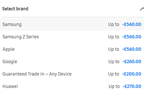 삼성전자의트레이드 인(Trade-in)’은 기존에 사용하던 중고폰을 반납하면 중고 스마트폰 가격에 최대 15만원(한국 기준)을 추가 보상해주는 프로그램으로 한국, 미국, 독일, 영국, 프랑스, 이탈리아, 중국, 태국 등 총 55개국에서 운영 중이다.
