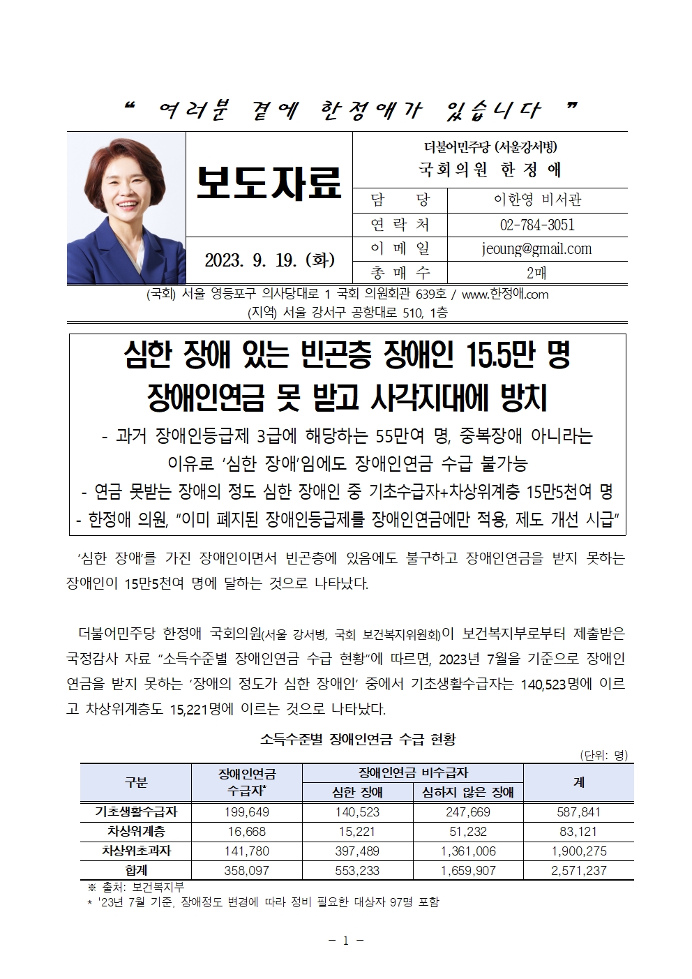 230919 [한정애의원 보도자료] 심한 장애 있는 빈곤층 장애인 15.5만명은 못받는 장애인연금.hwp