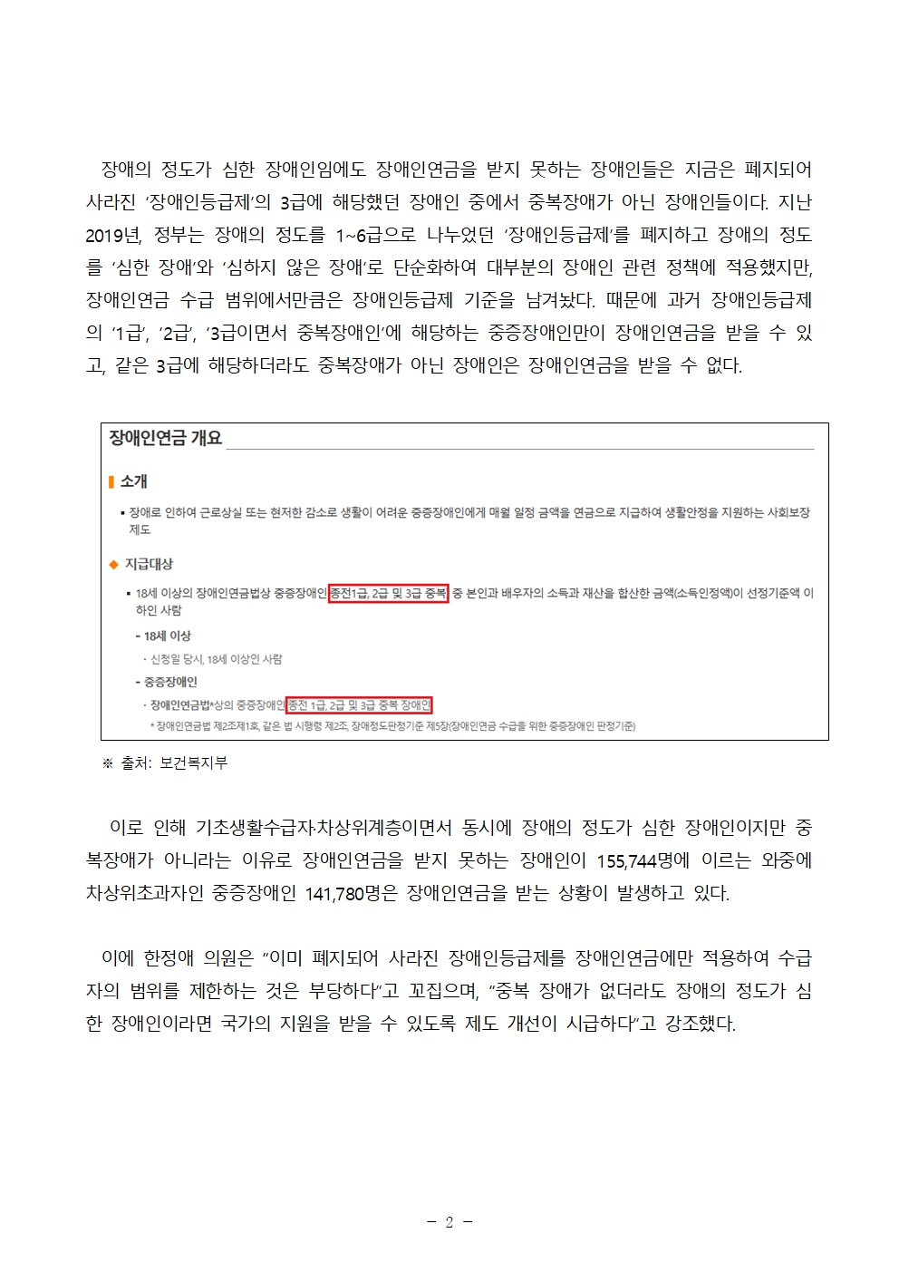 [한정애의원 보도자료] 심한 장애 있는 빈곤층 장애인 15.5만명은 못받는 장애인연금