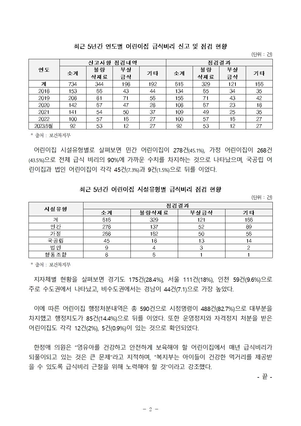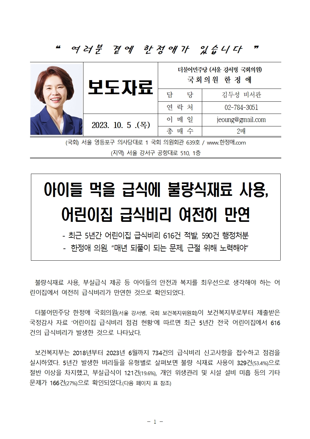 231005_[한정애의원 보도자료] 어린이집 급식비리 여전히 만연.hwp