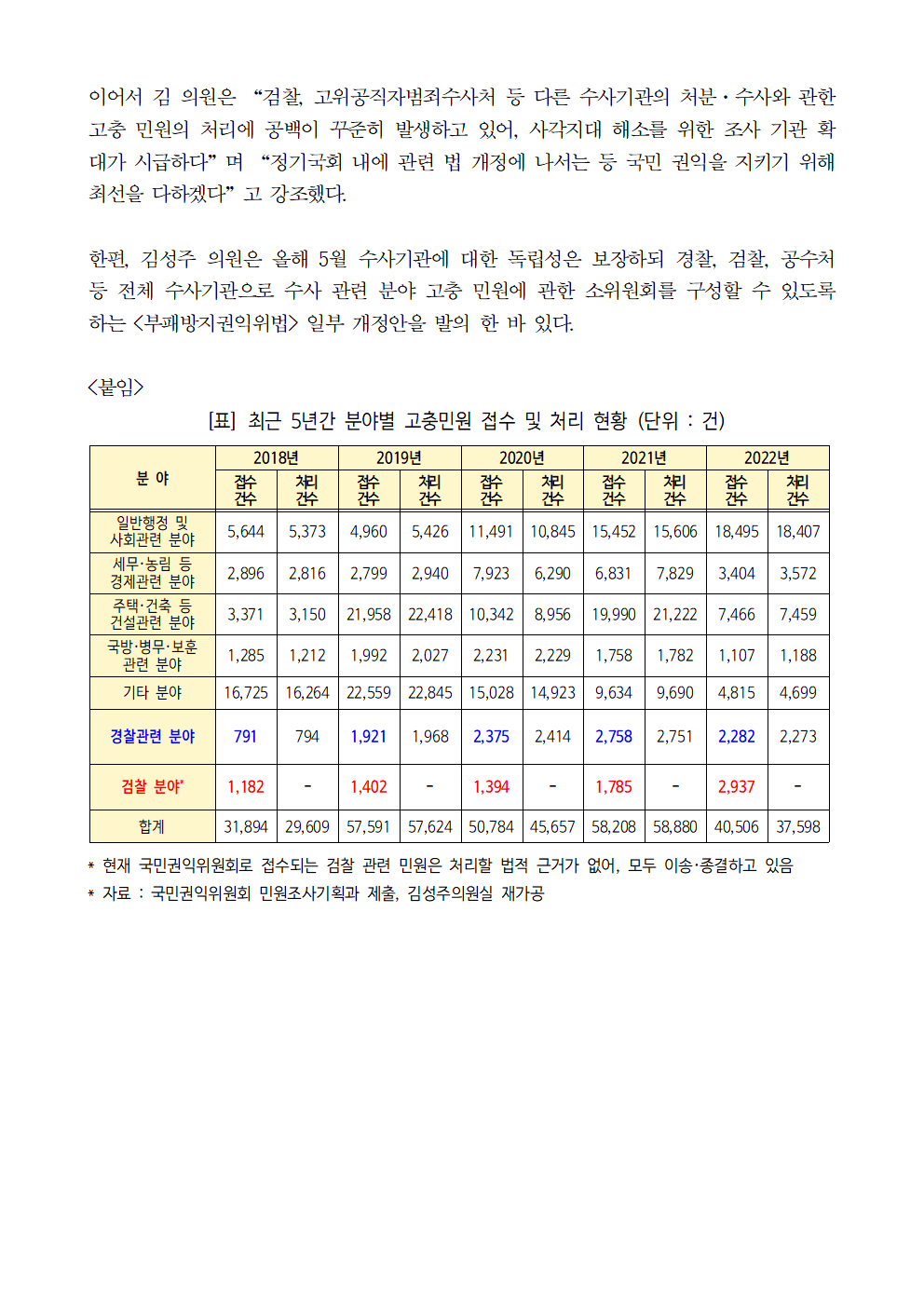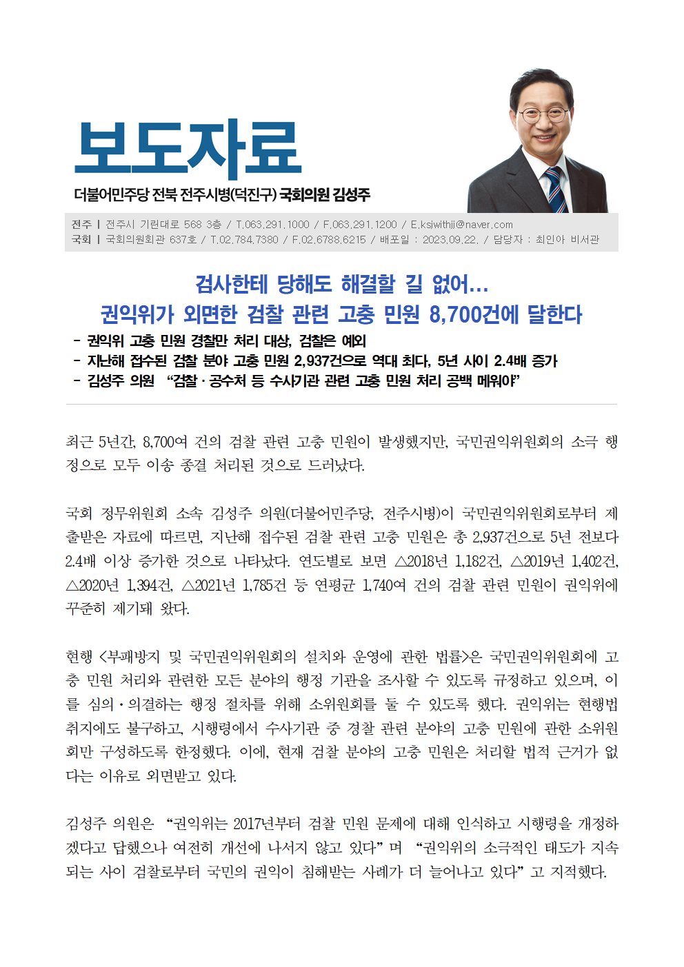 [김성주의원 보도자료] 검사한테 당해도 해결할 길 없어... 권익위가 외면한 검찰 관련 고충 민원 8,700건에 달한다