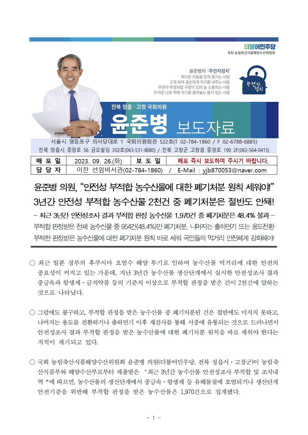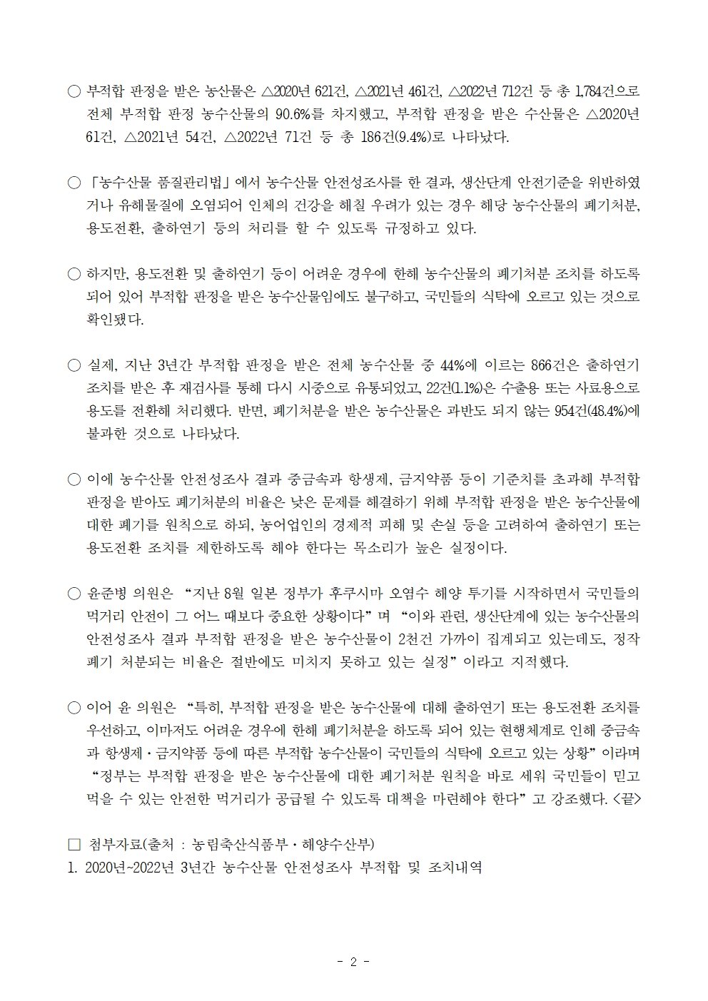 230926 [윤준병 의원 국정감사 보도자료] 윤준병 의원 3년간 안전성 부적합 농수산물 2천건 중 폐기처분은 절반도 안돼!.hwp