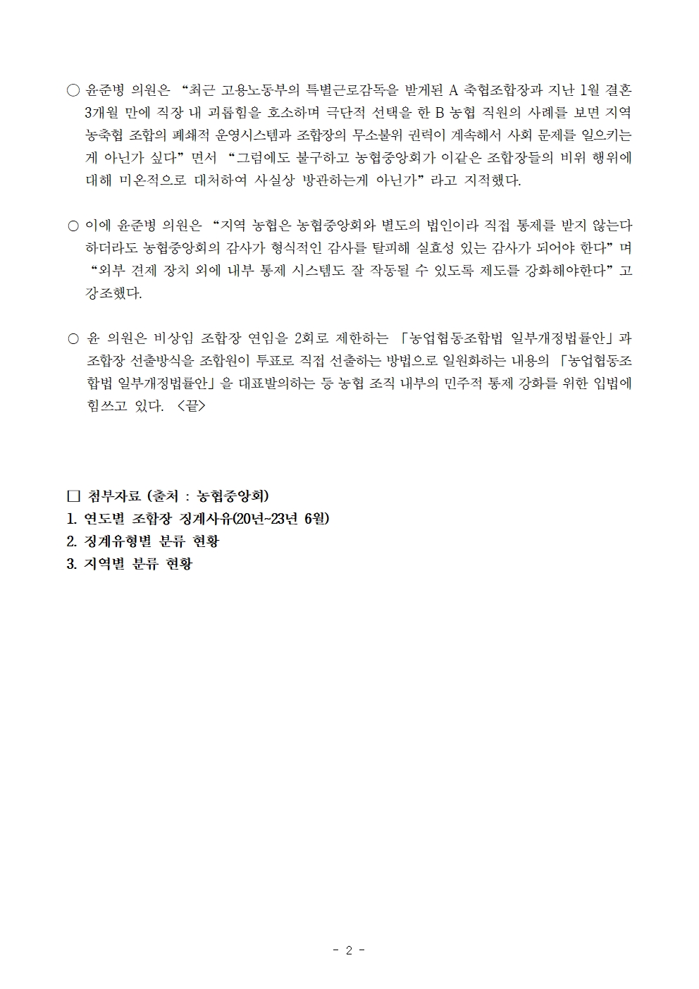 [윤준병 의원 국정감사 보도자료] 윤준병 의원, 농협중앙회의 유명무실한 감독기능이 부른 지역농협 조합장의 무소불위 권력