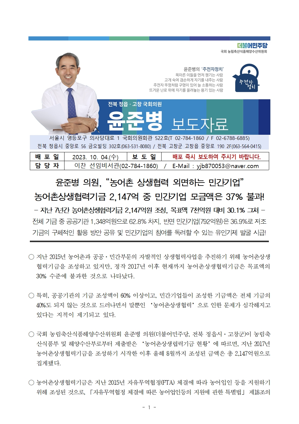 231004 [윤준병 의원 국정감사 보도자료] 윤준병 의원 농어촌상생협력기금 2147억 중 민간기업 모금액은 37% 불과!.hwp