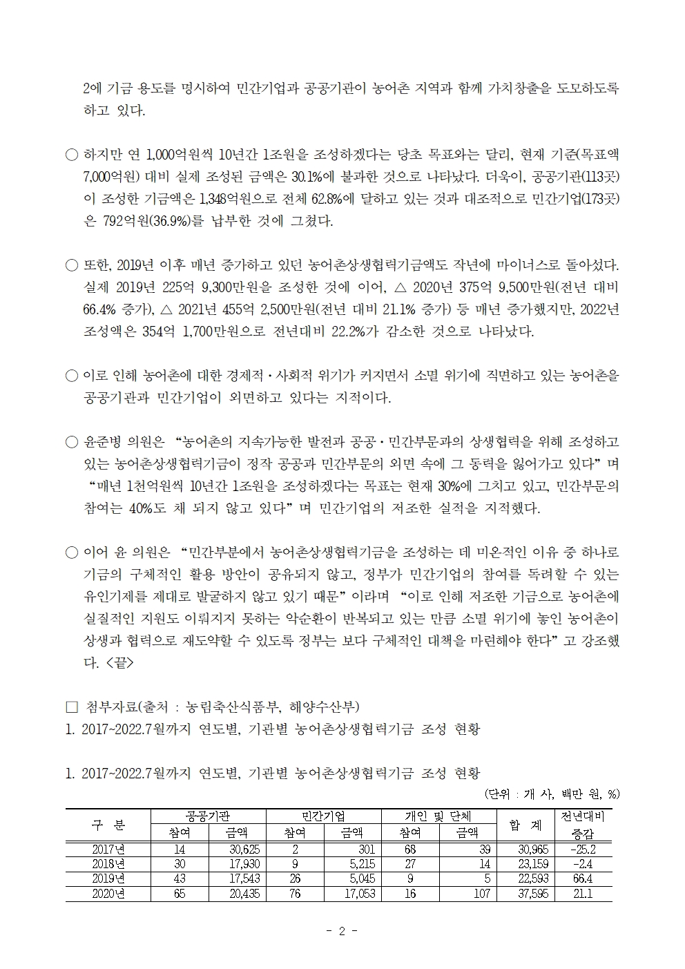 [윤준병 의원 국정감사 보도자료] 윤준병 의원, 농어촌상생협력기금 2,147억 중 민간기업 모금액은 37% 불과!