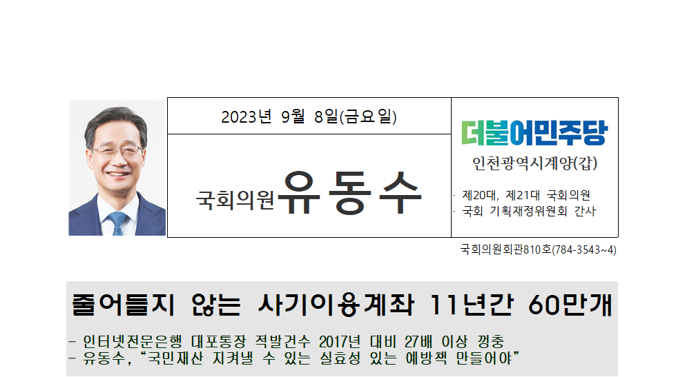 [국회의원 유동수 보도자료] 줄어들지 않는 사기이용계좌 11년간 60만개