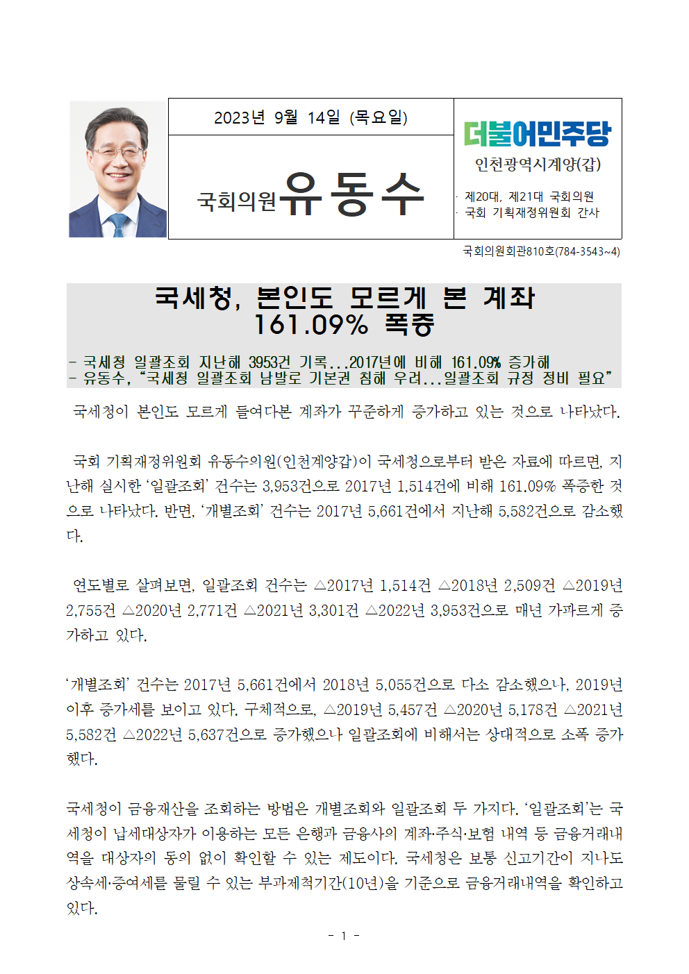 (230914 유동수_의원_보도자료)__국세청__본인도_모르게_본_계좌_161.09%_폭증.hwp