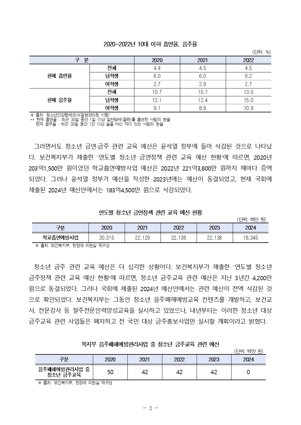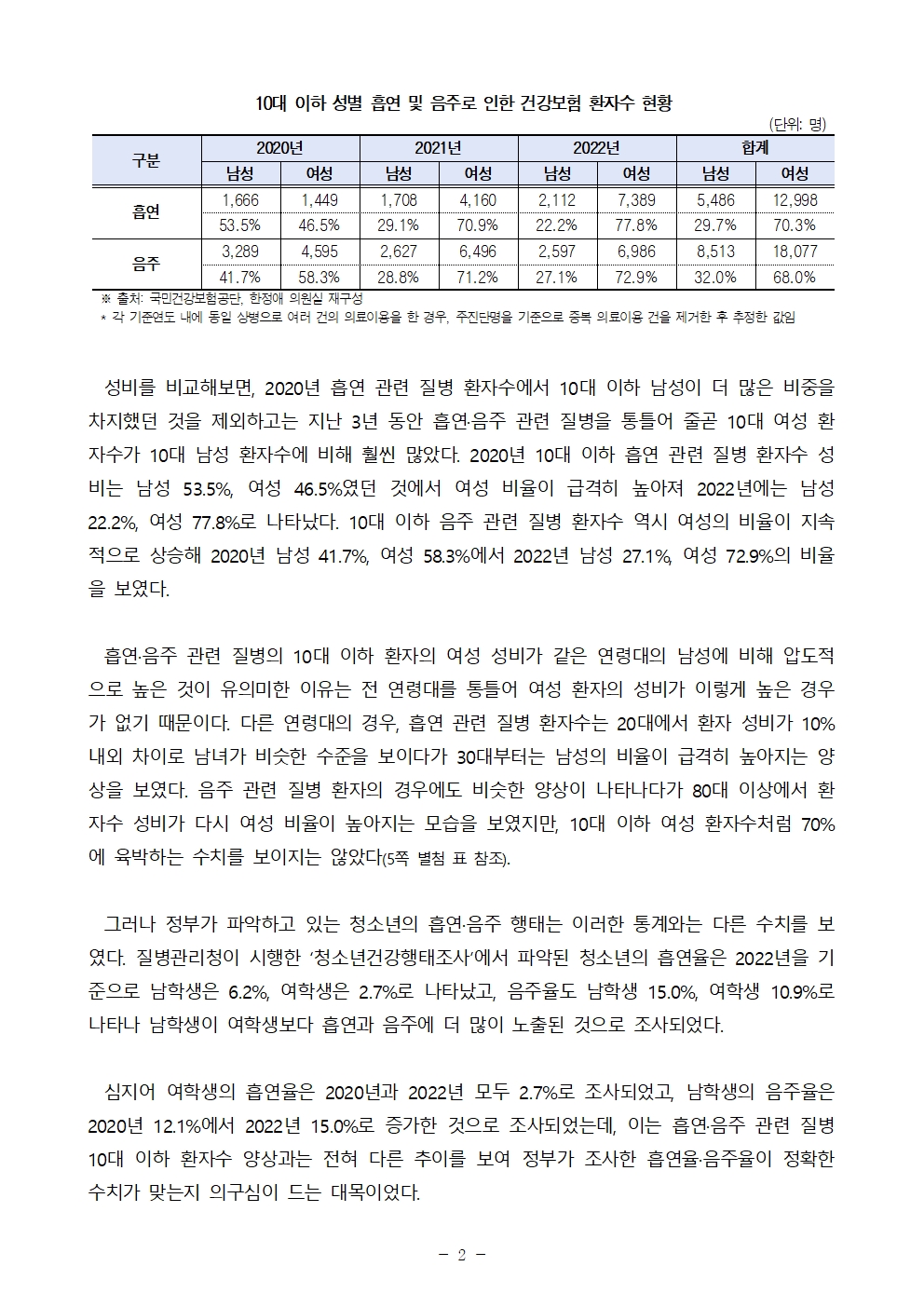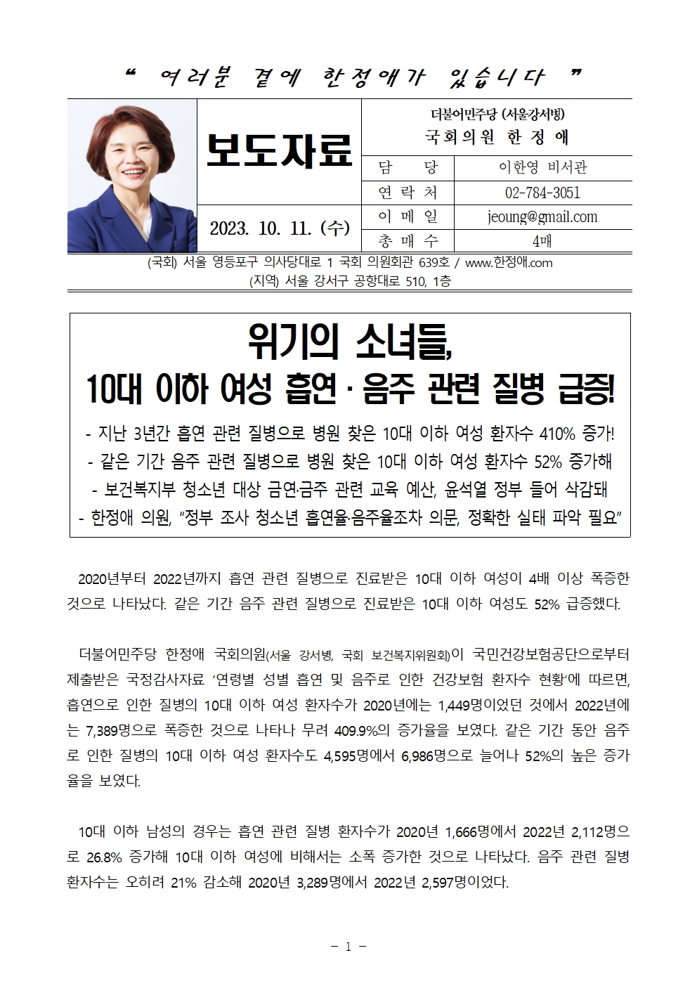 231011 [한정애의원 보도자료] 위기의 소녀들 여자청소년 흡연·음주·자살 급증.hwp