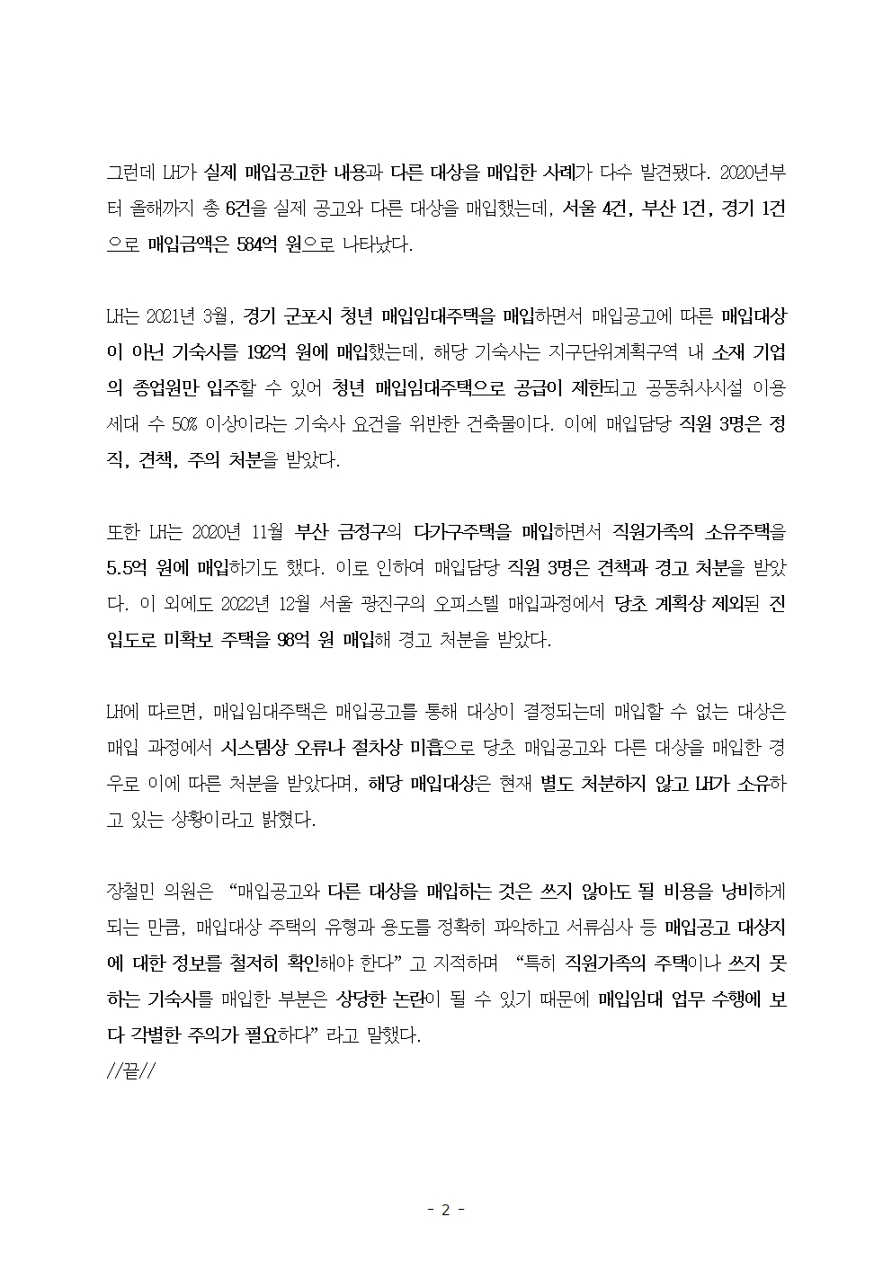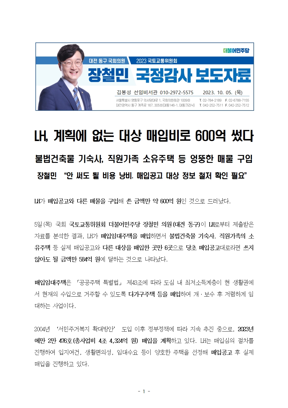 [국회의원 장철민 보도자료] LH, 계획에 없는 대상 매입비로 600억 썼다