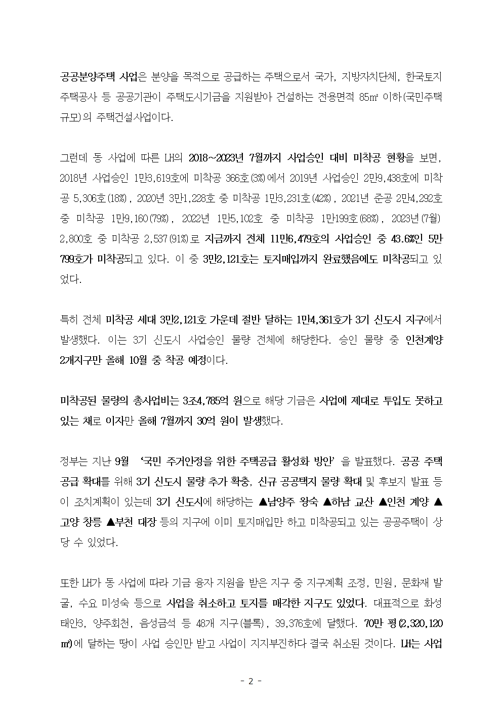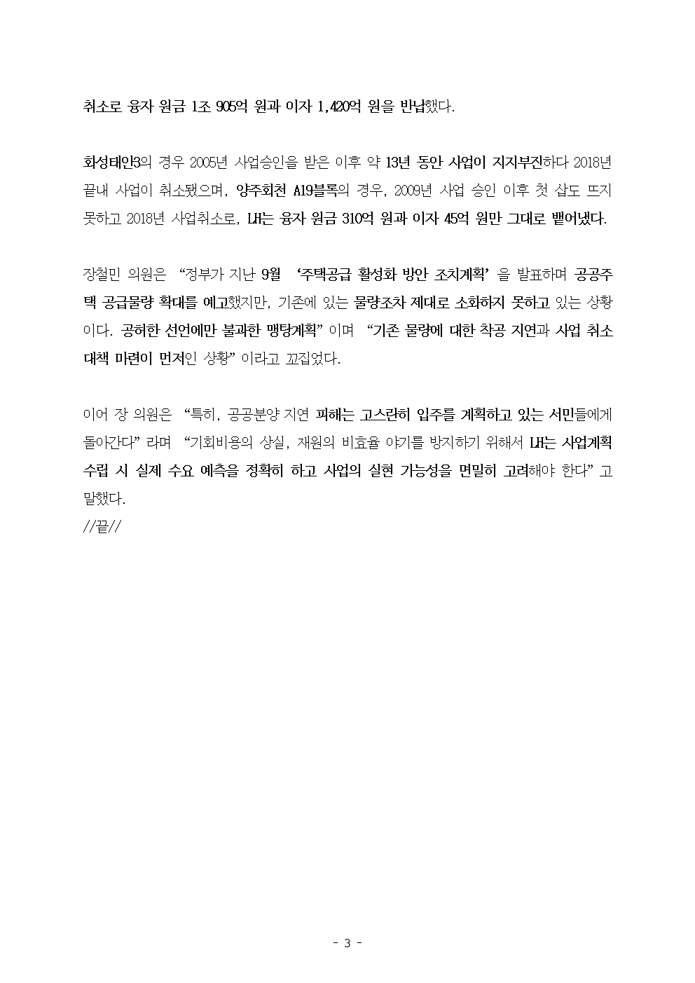 [국회의원 장철민 보도자료] 3기 신도시 공공분양 물량 단 1곳도 삽 못떠