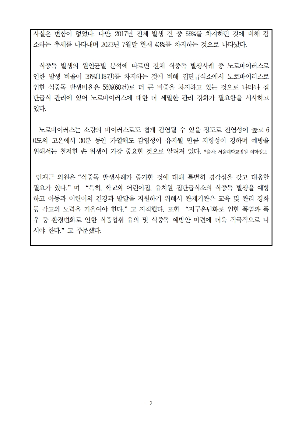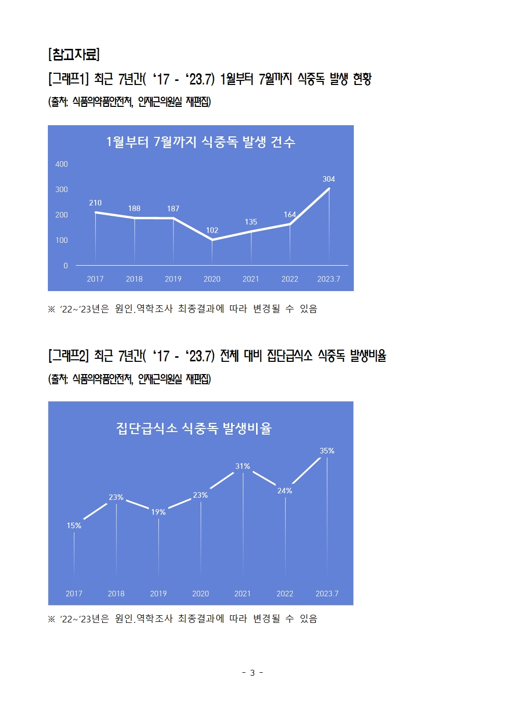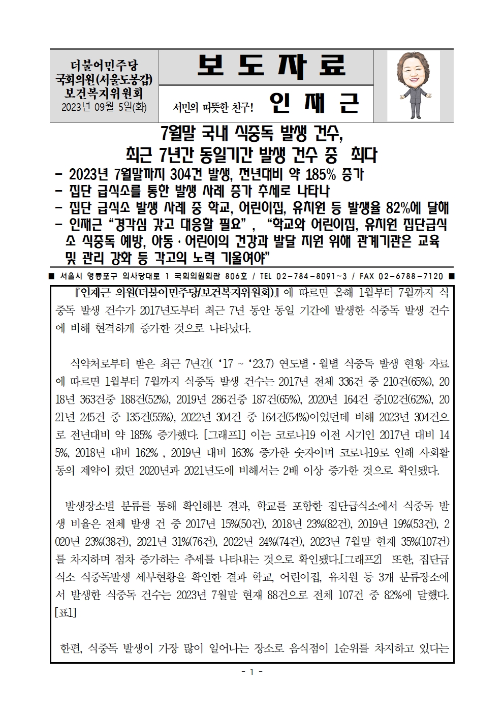 230905_[인재근의원실 보도자료] 7월말 국내 식중독 발생 건수 최근 7년간 동일기간 발생 건수 중 최다 .hwp