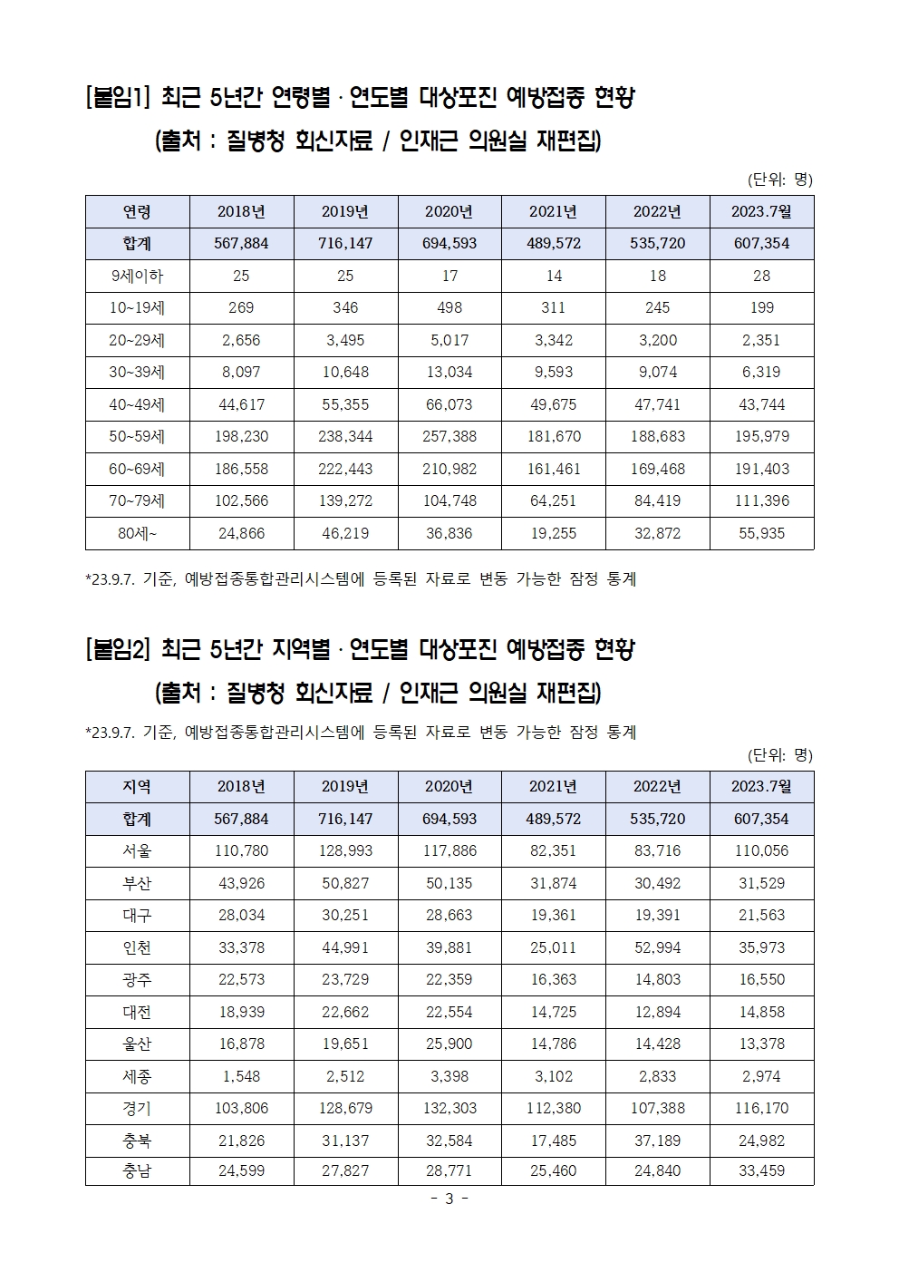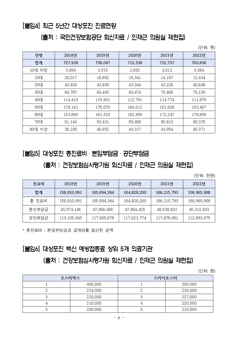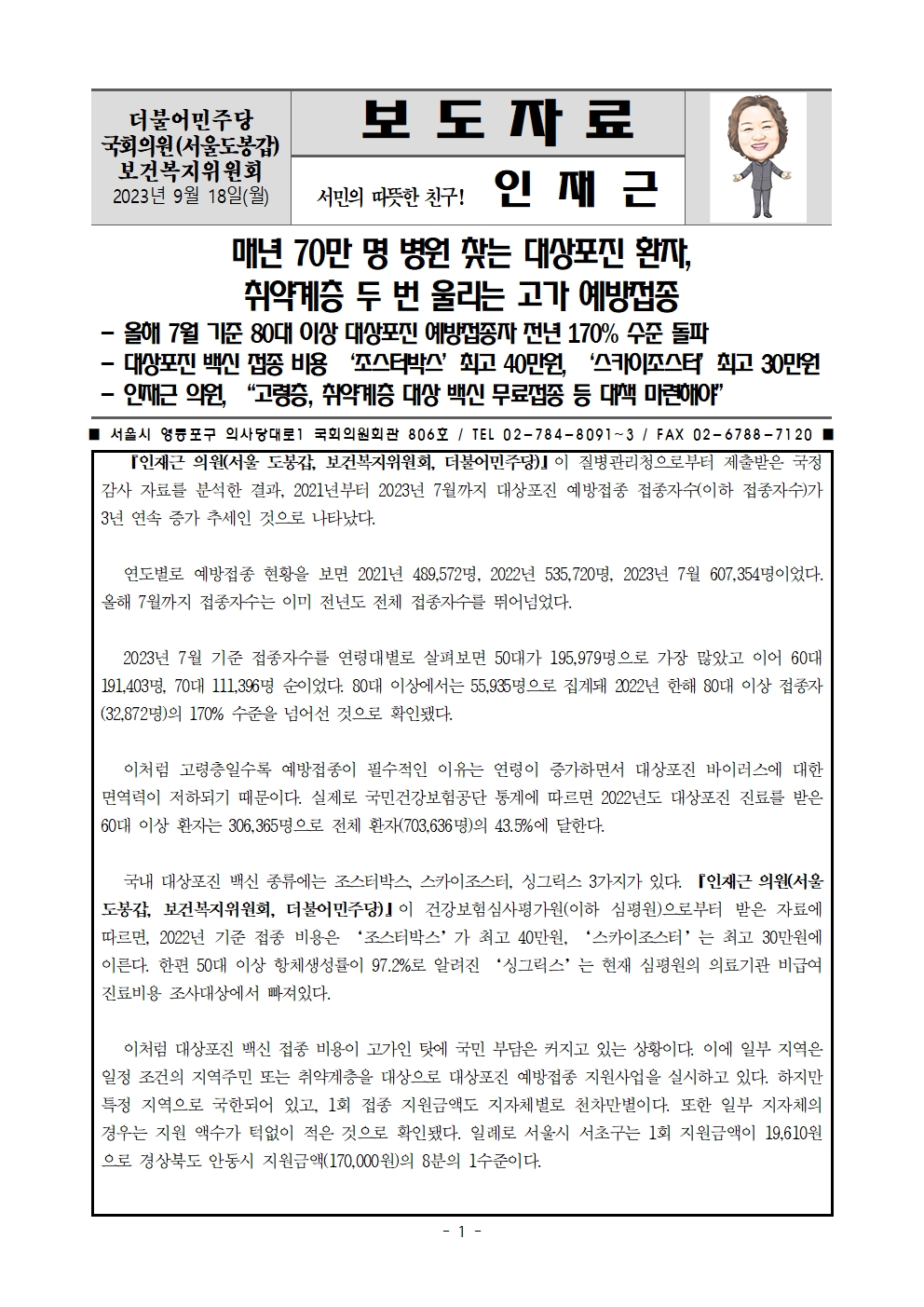[인재근의원실 보도자료] 매년 70만 명 병원 찾는 대상포진 환자, 취약계층 두 번 울리는 고가 예방접종