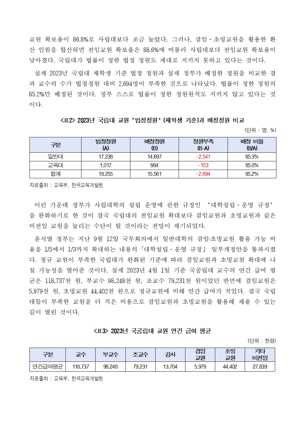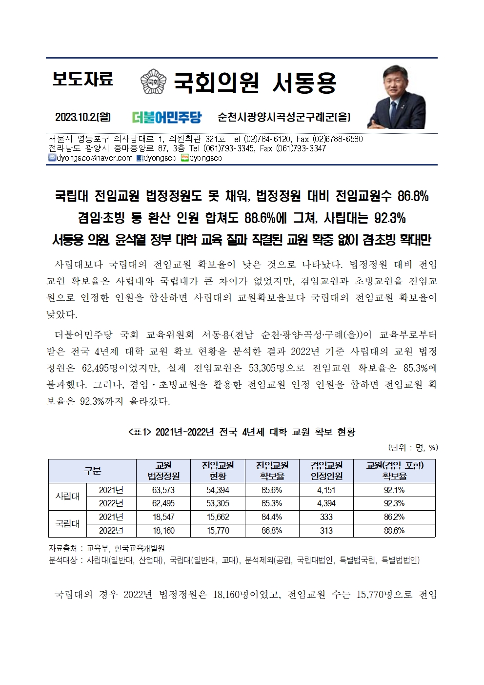 5. 231002_국감_서동용_국립대_전임교원_법정정원_못_채워.hwp