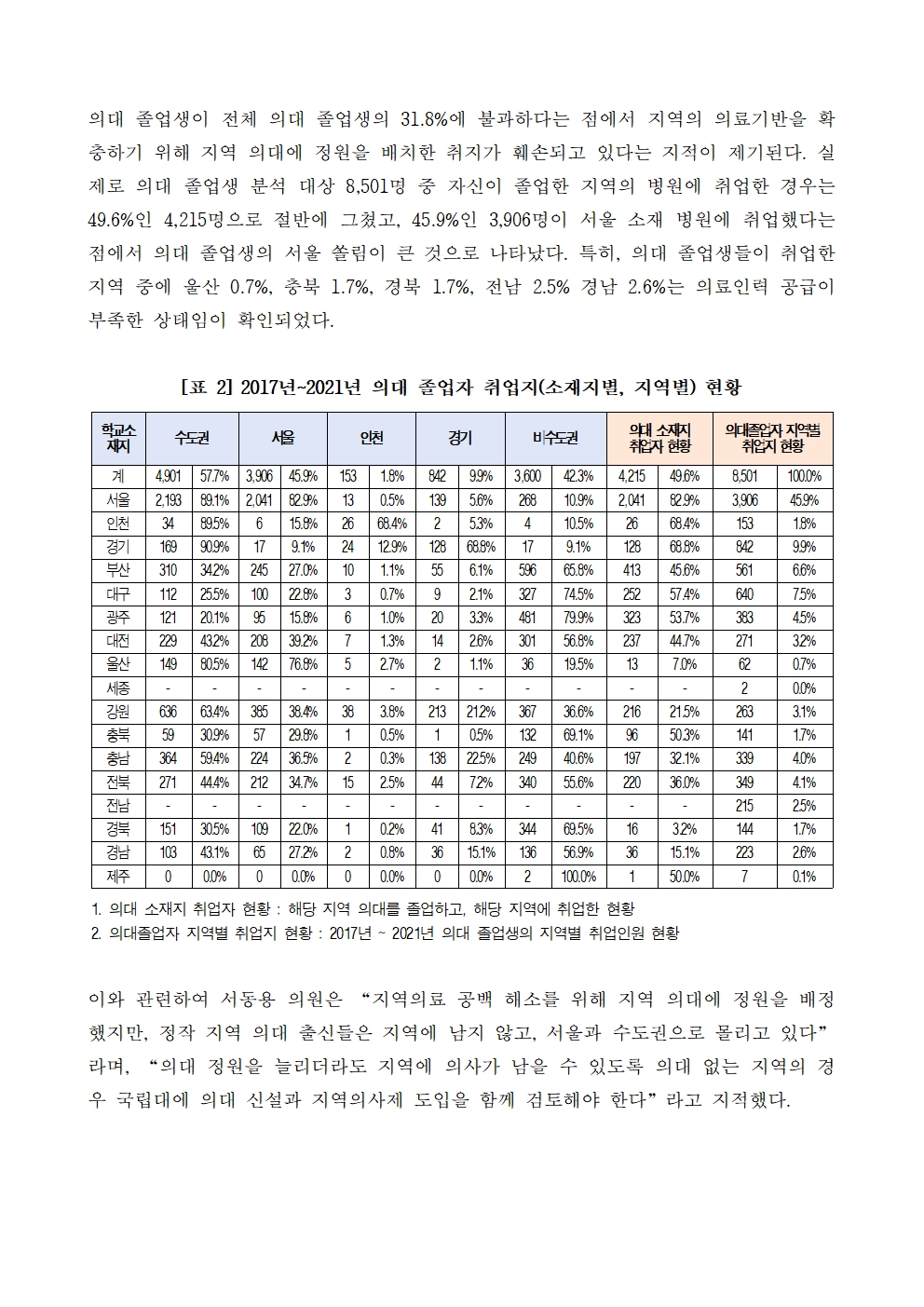 [서동용 의원] 의대 졸업생의 45.9% 서울 취업, 수도권으로 보면 57.7%