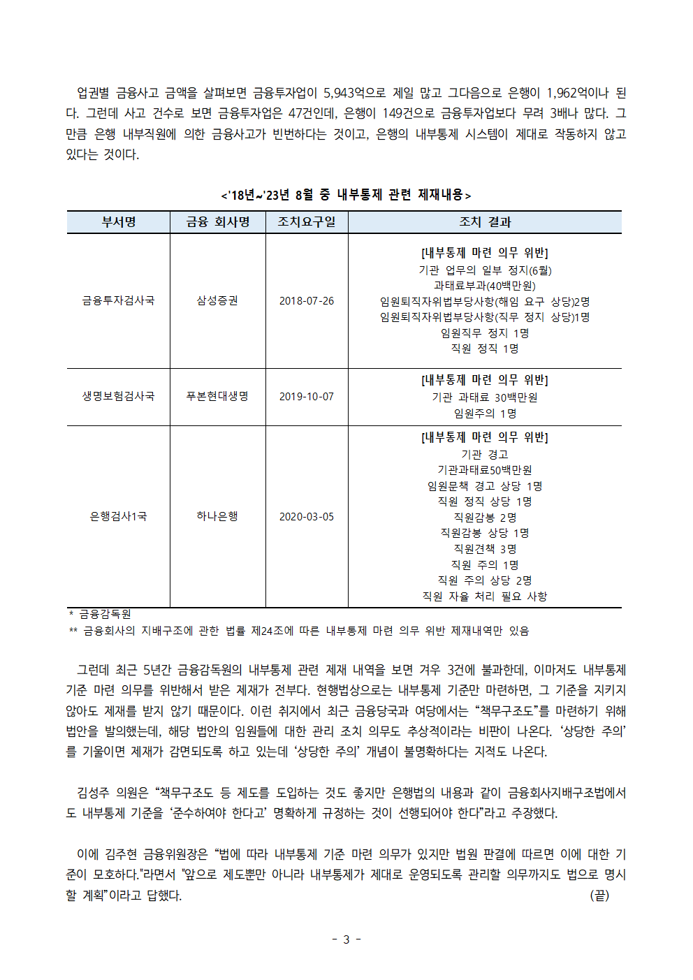 [김성주의원 보도자료] 금융사 내부통제 문제와 관련한 현행법 명확하게 개정하고 금융 신뢰 회복할 수 있어야