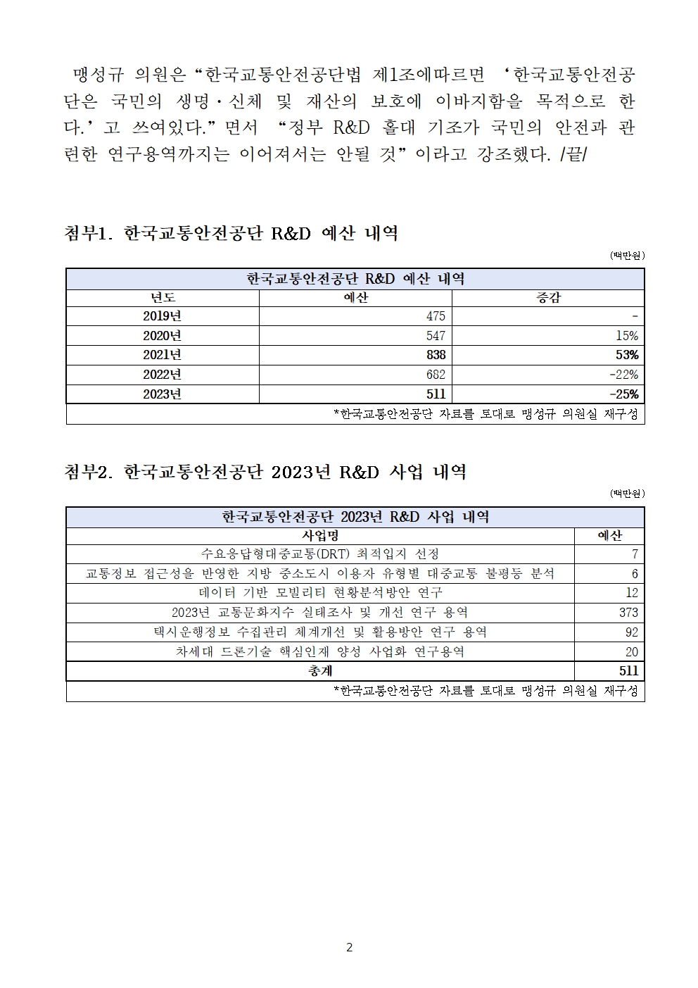 [맹성규의원 보도자료] 한국교통안전공단 마저, 안전연구 용역 홀대 23년 자체‘안전연구용역’0건