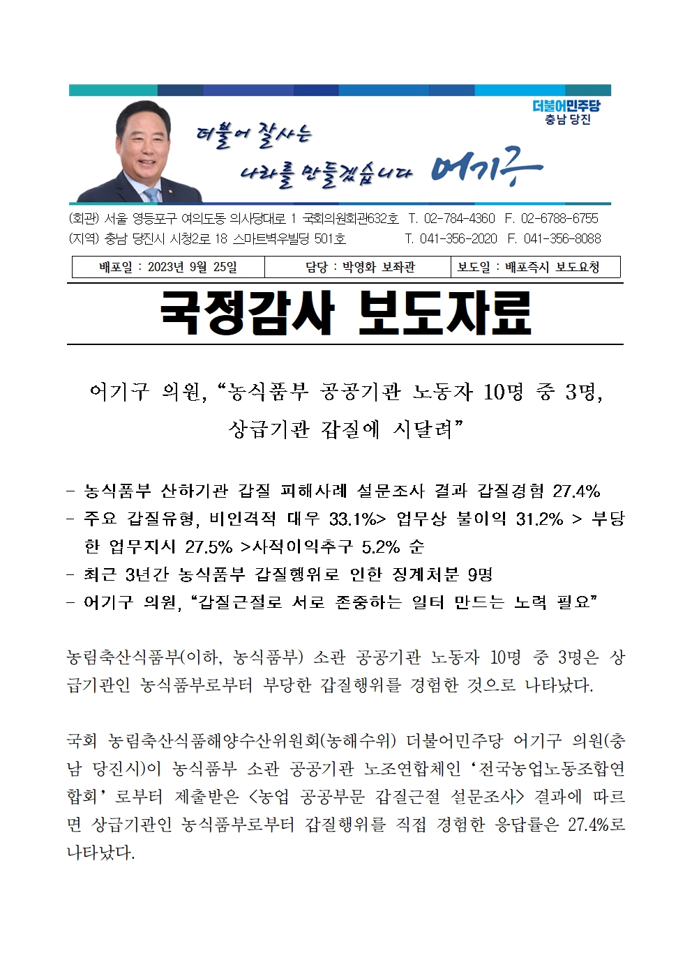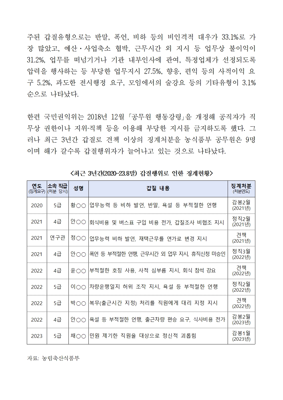 [어기구의원 국감보도자료] 농식품부 공공기관, 상급기관 갑질 10명 중 3명 경험