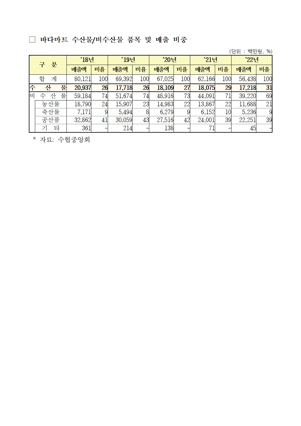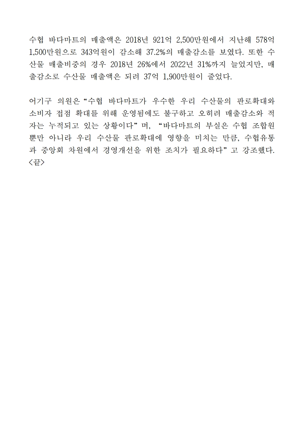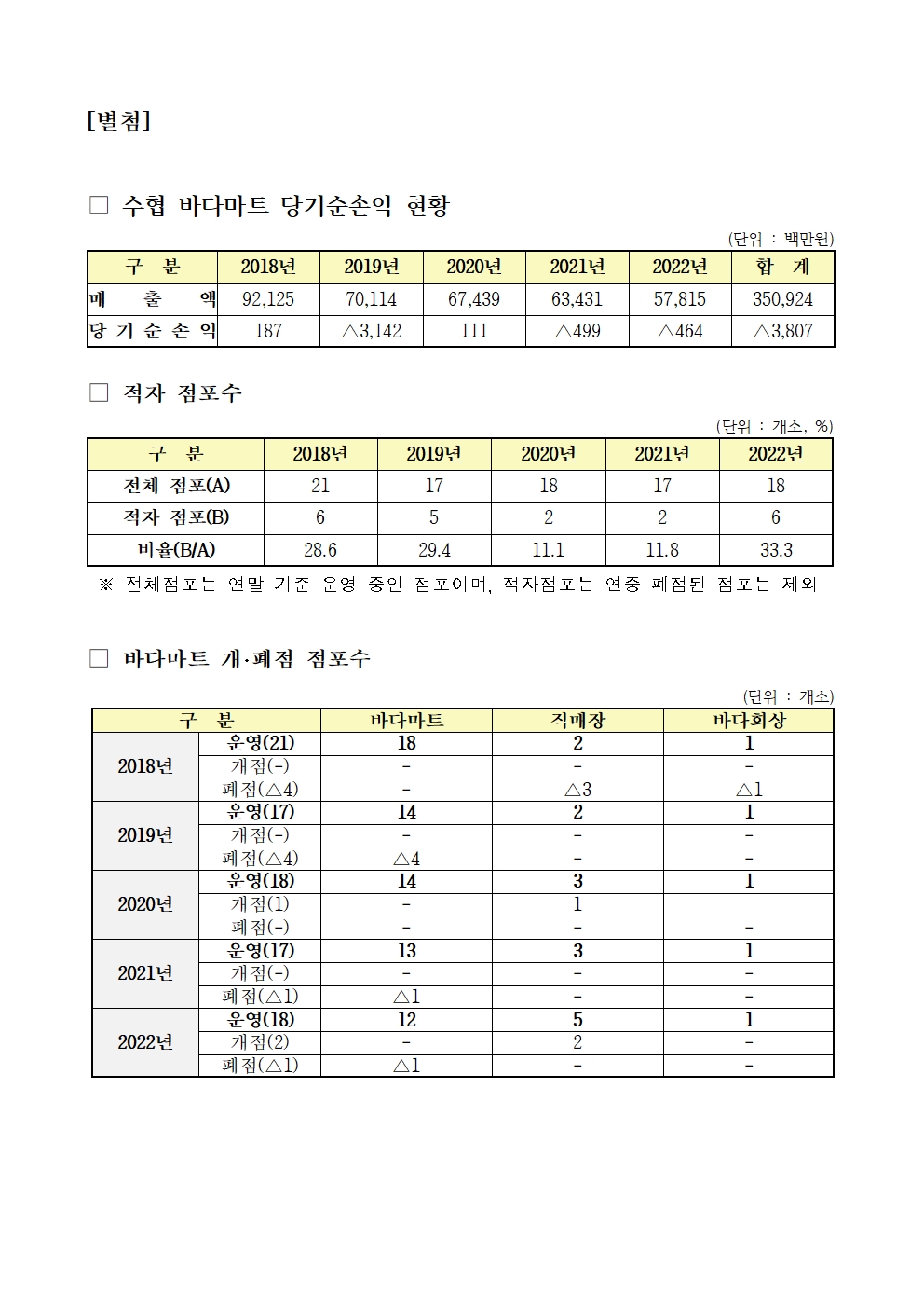 [어기구의원 국정감사 보도자료] 수협 바다마트, 적자점포 세 곳 중 한 곳…최근 5년간 누적 손실 약 39억원