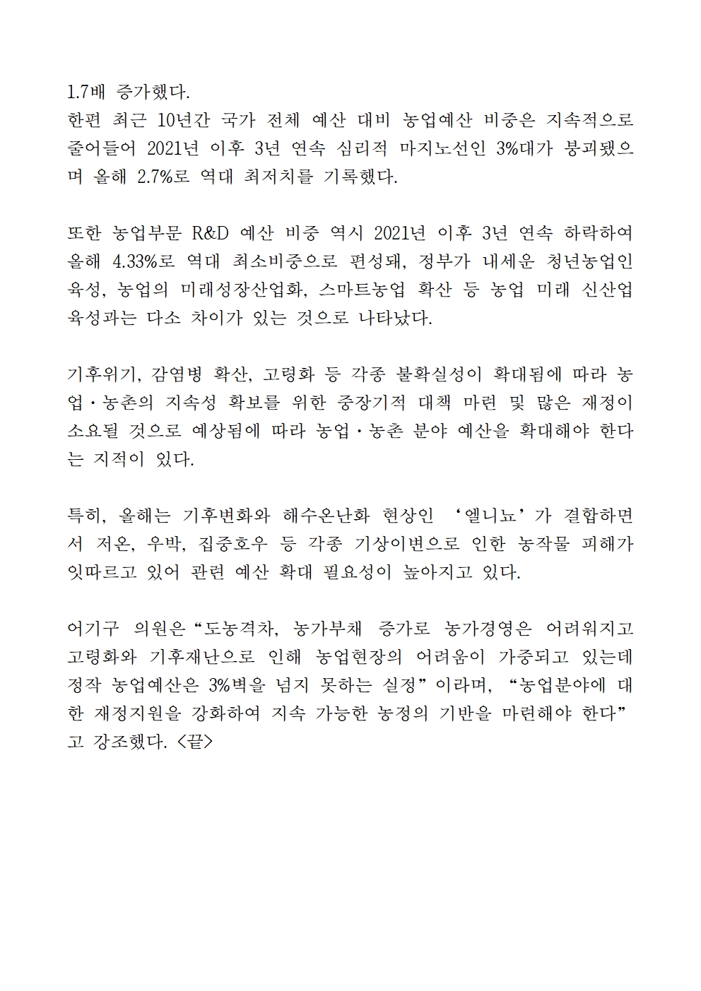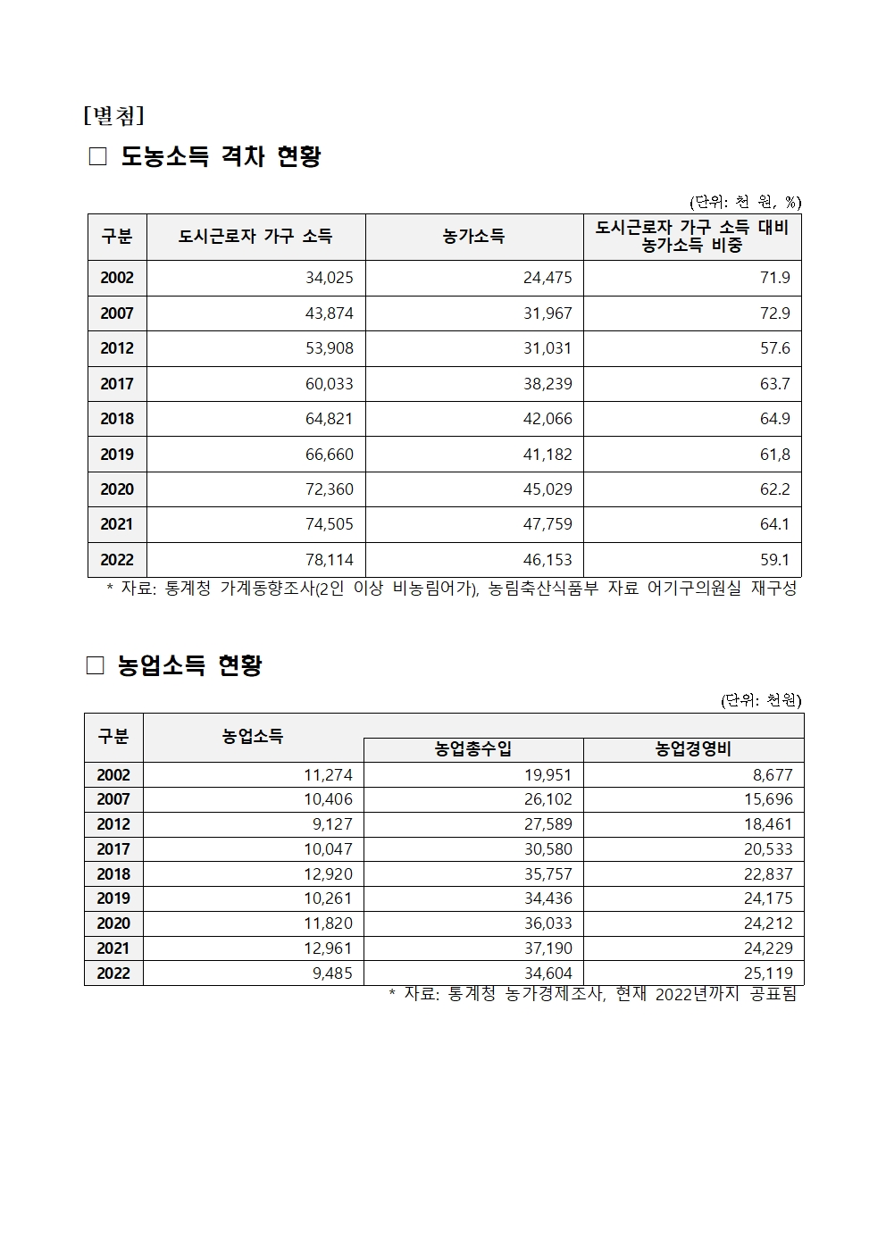 [어기구의원 국정감사 보도자료] 지난해 농가, 도시근로자보다 연소득 3200만원 적어…도농 소득격차 59%로 벌어져