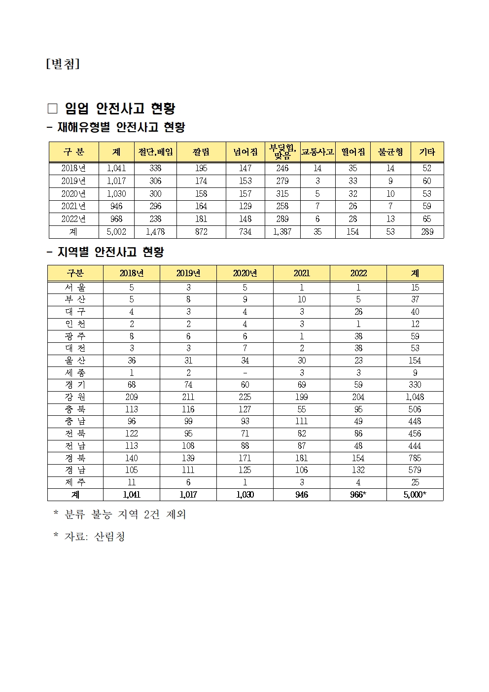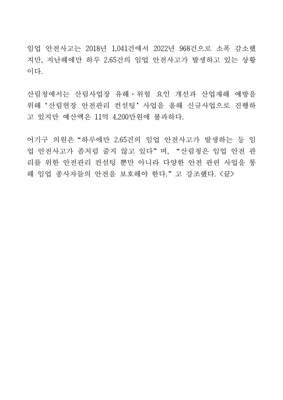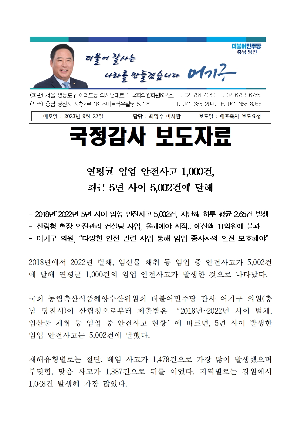 [어기구의원 국정감사 보도자료] 연평균 임업 안전사고 1,000건, 최근 5년 사이 5,002건에 달해