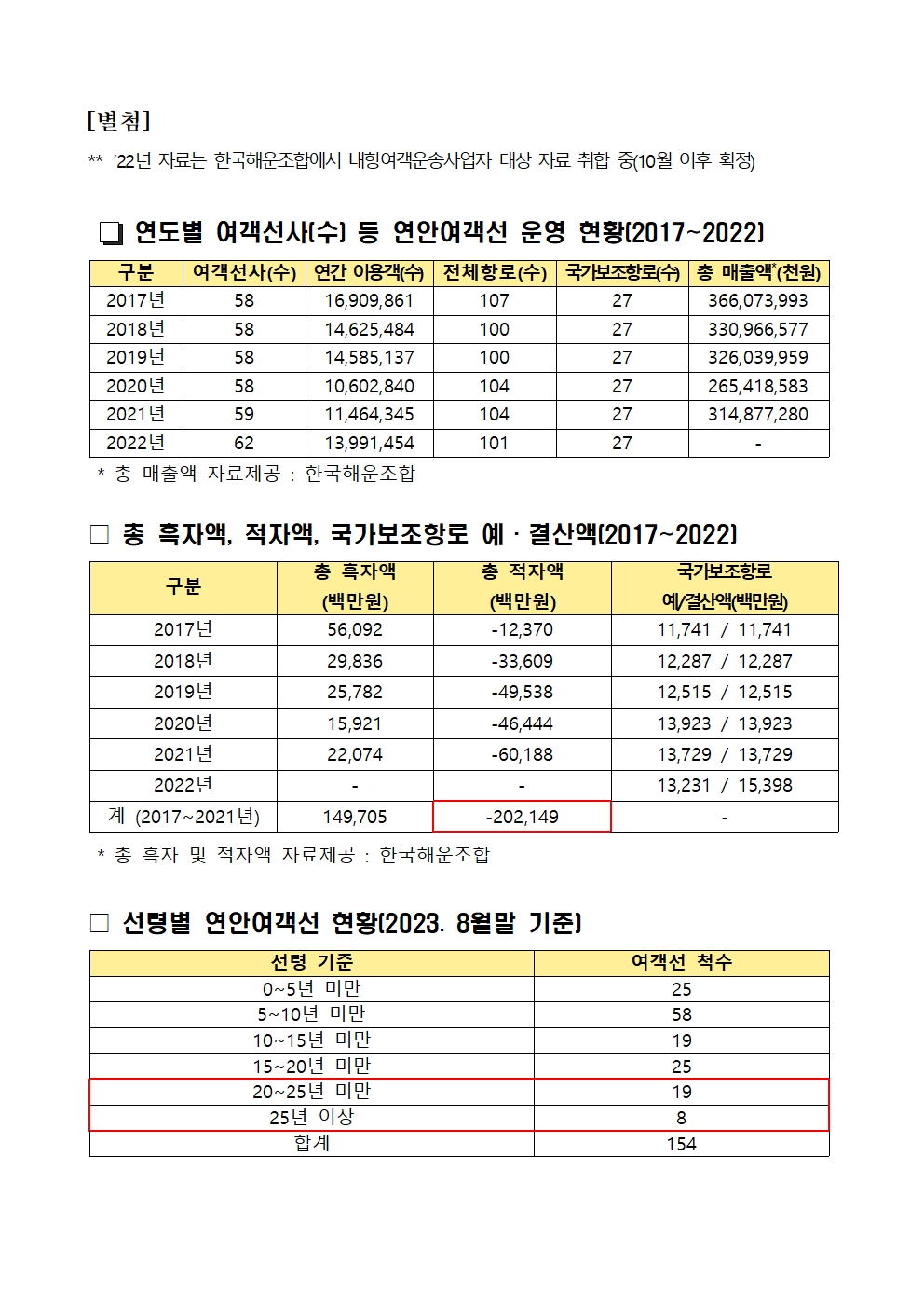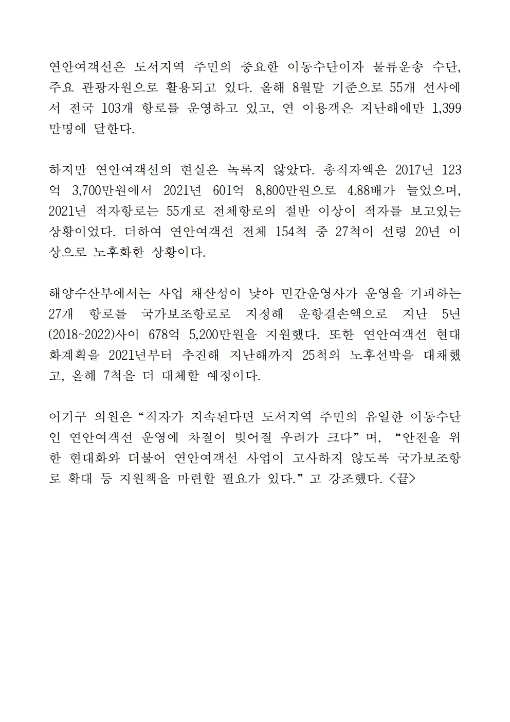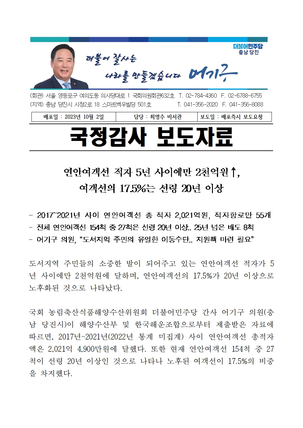 231002 [어기구의원 국정감사 보도자료] 연안여객선 적자 5년 사이에만 2천억원↑ 여객선의 17.5%는 선령 20년 이상.hwp