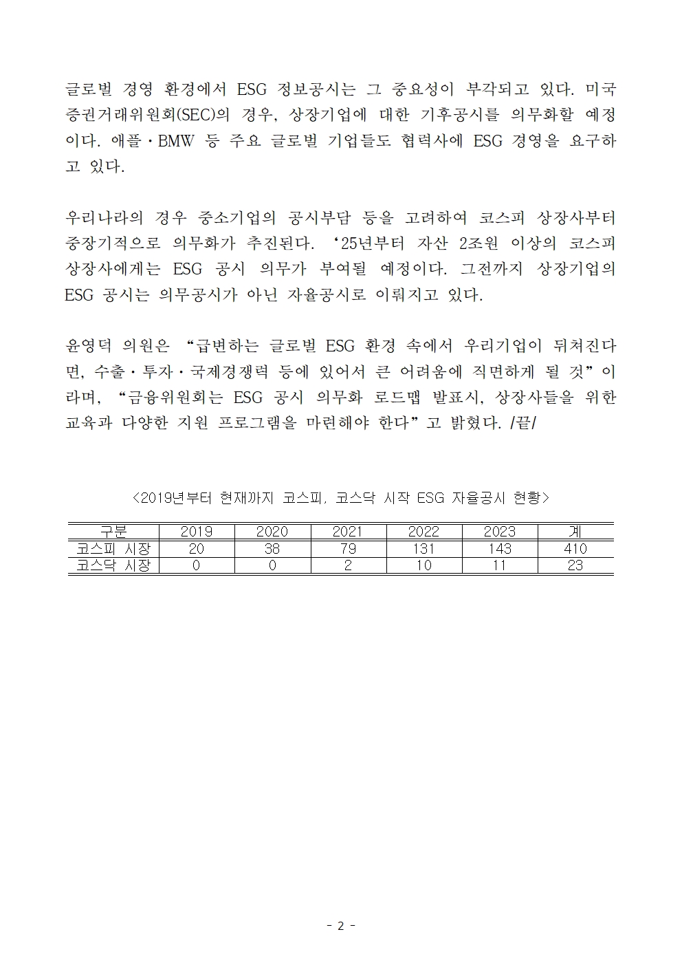 [윤영덕의원 국감 보도자료]코스피 상장사의 ESG 자율 공시 성적은?