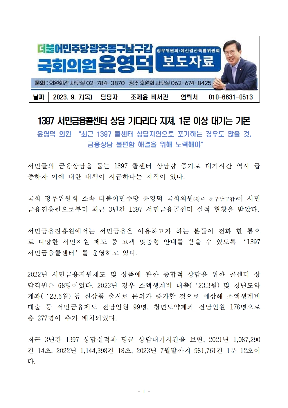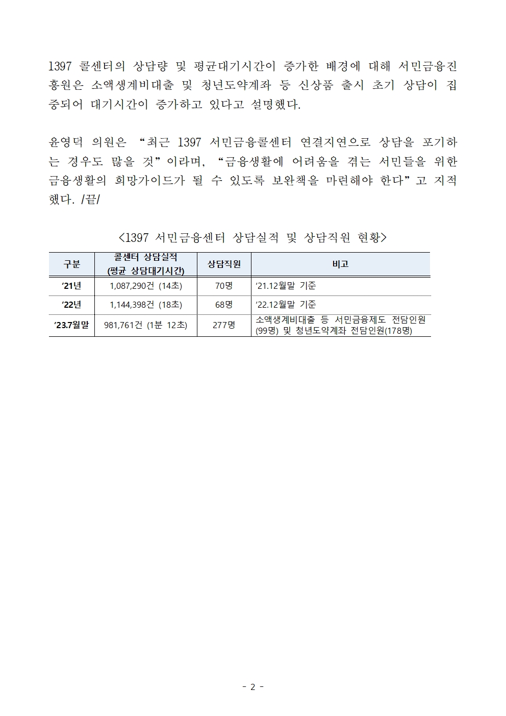 230907_윤영덕_보도자료_1397 서민금융콜센터 상담 기다리다 지쳐_ 1분 이상 대기는 기본.hwp