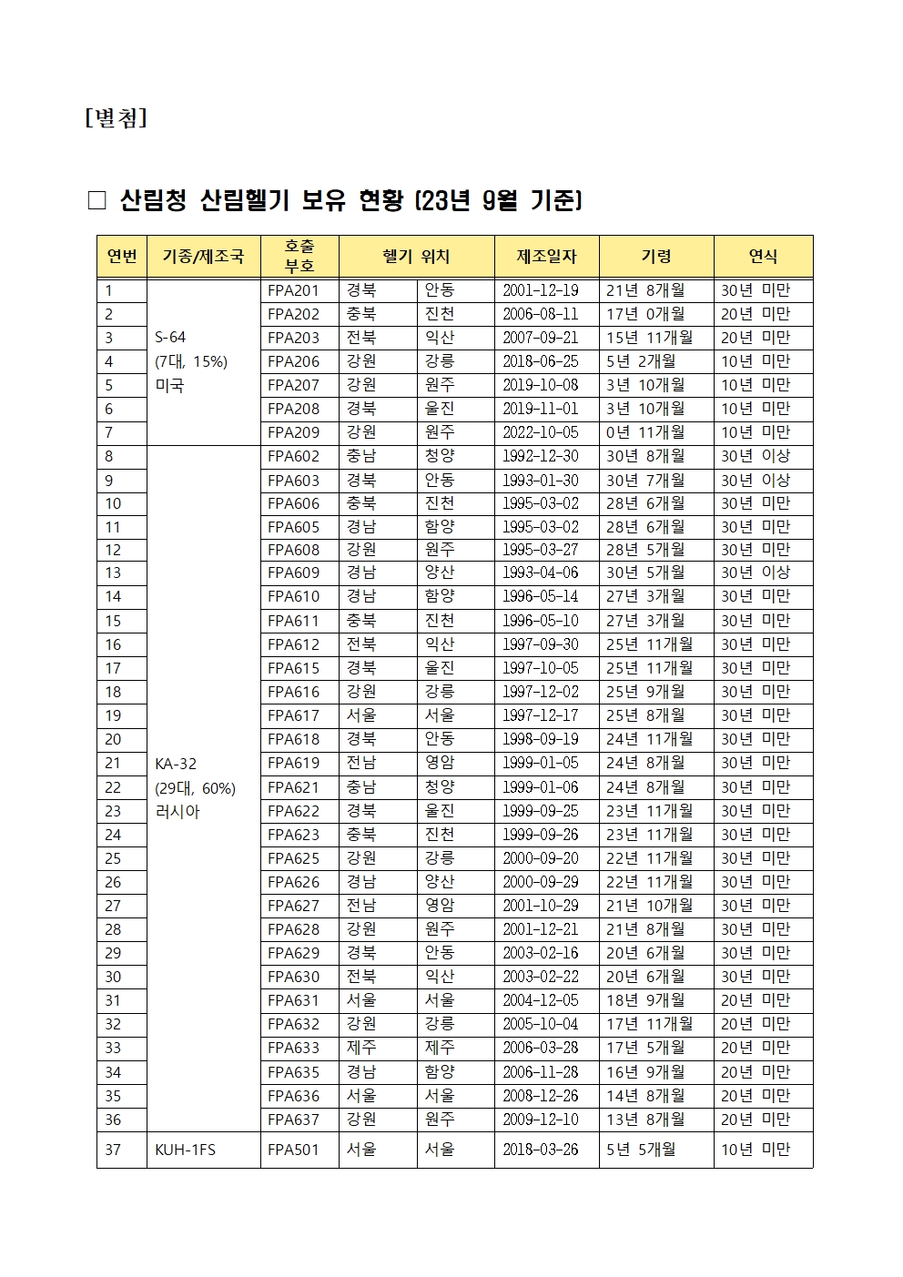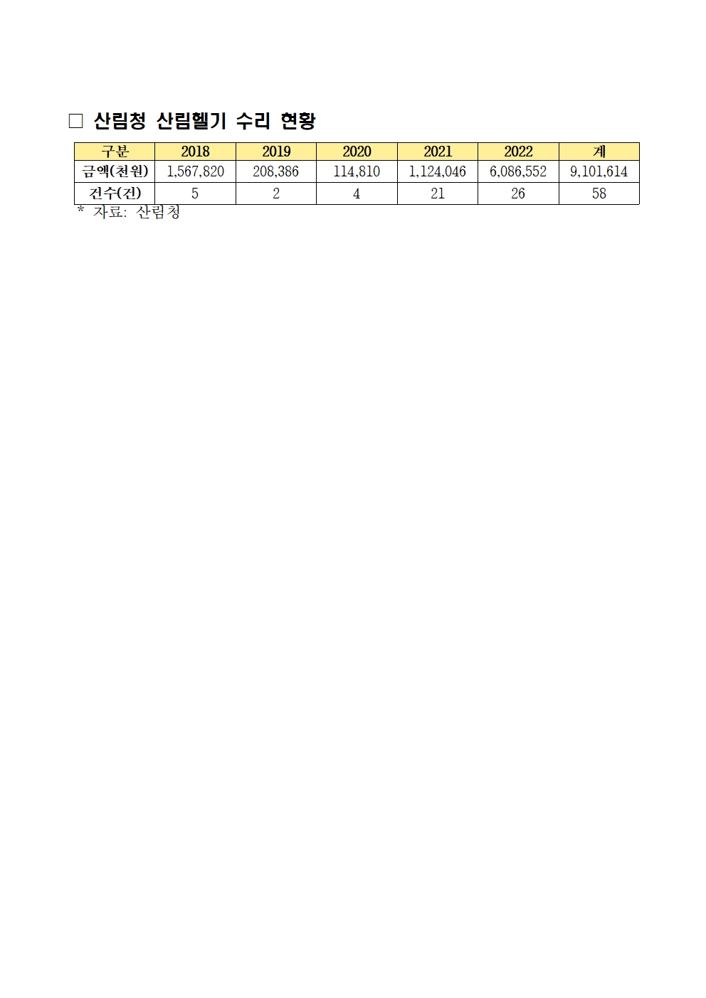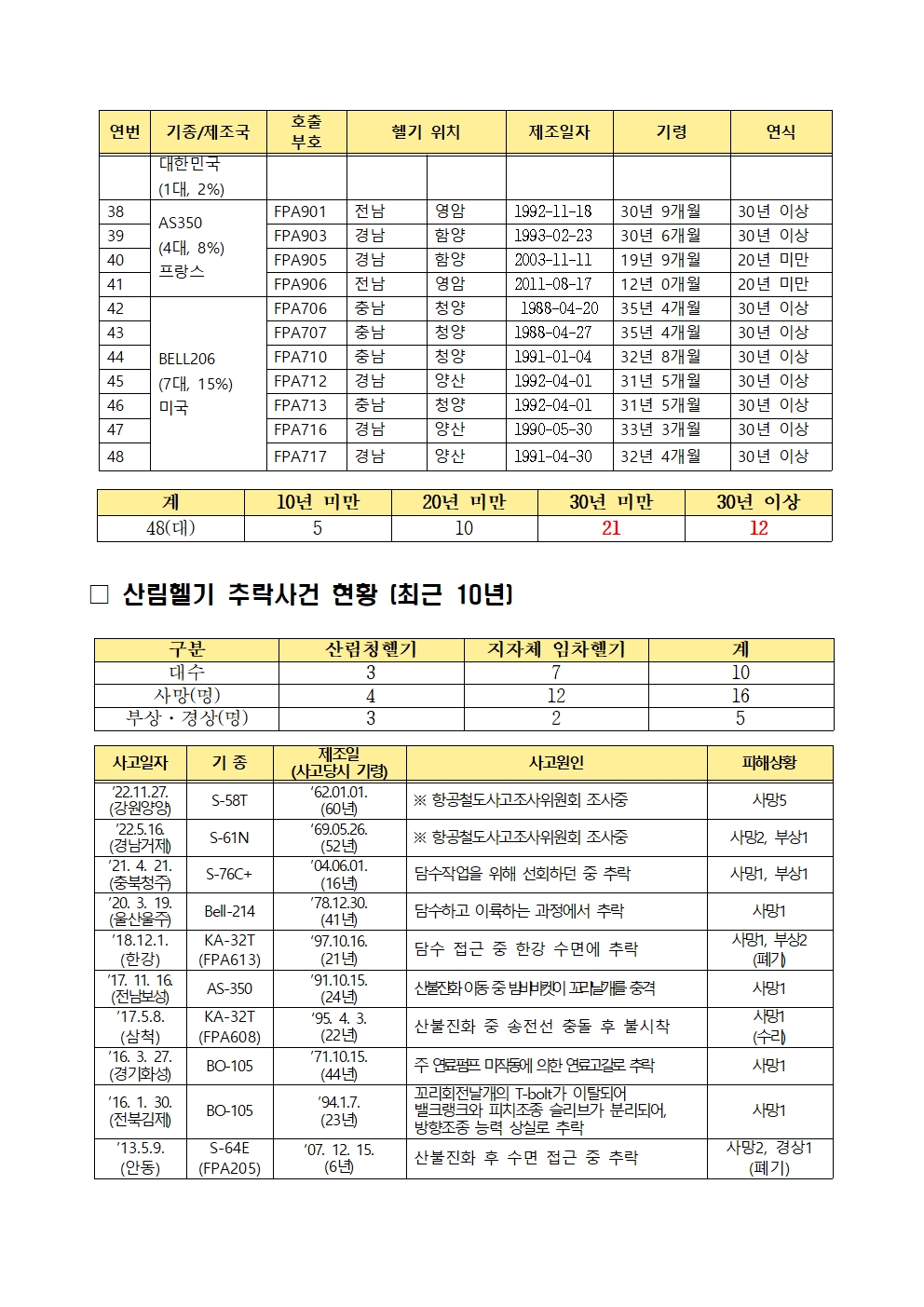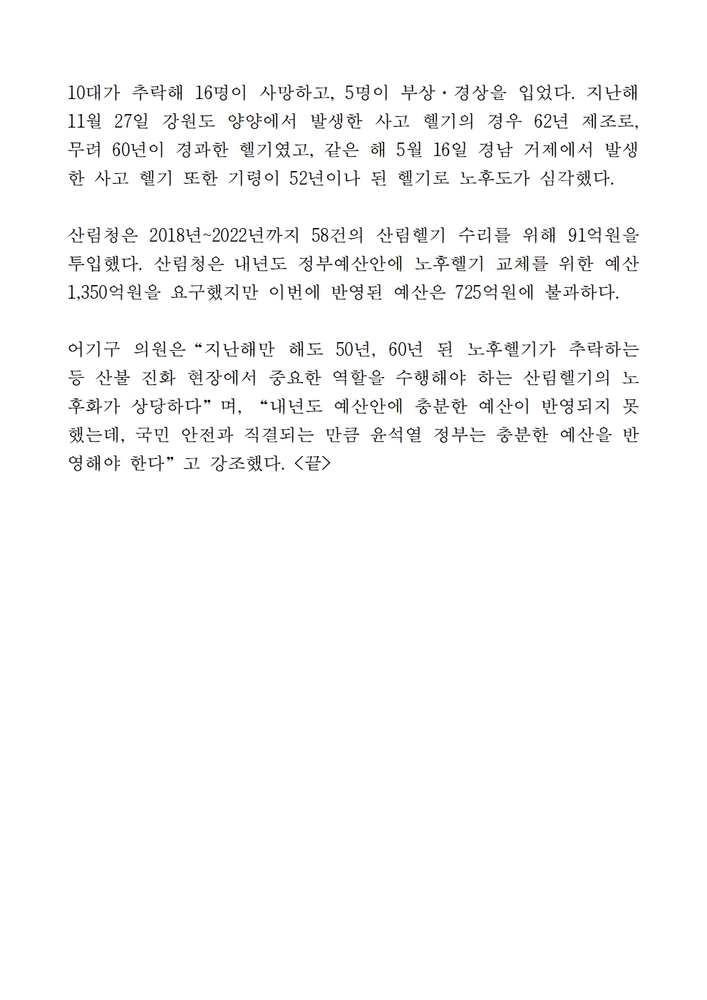[어기구의원 국정감사 보도자료] 산림청 산림헬기 68.8%가 20년 넘어, 최근 5년새 수리비용 91억원