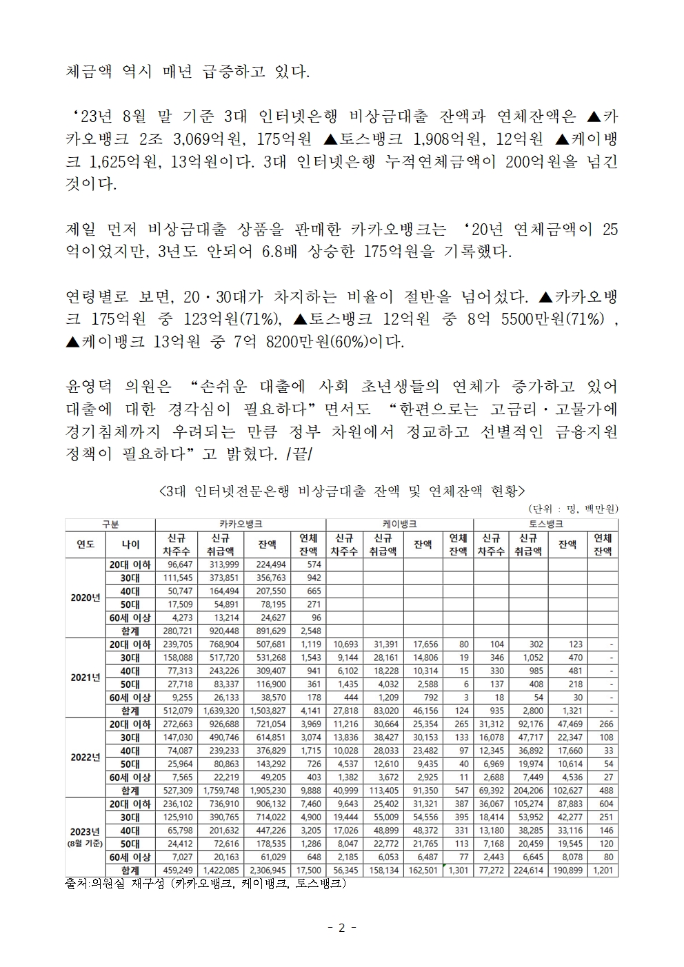 [윤영덕의원 국감 보도자료]고금리에 인터넷은행 비상금대출 연체금액 급상승...카카오뱅크‘20년대비 6.8배 상승한 175억원