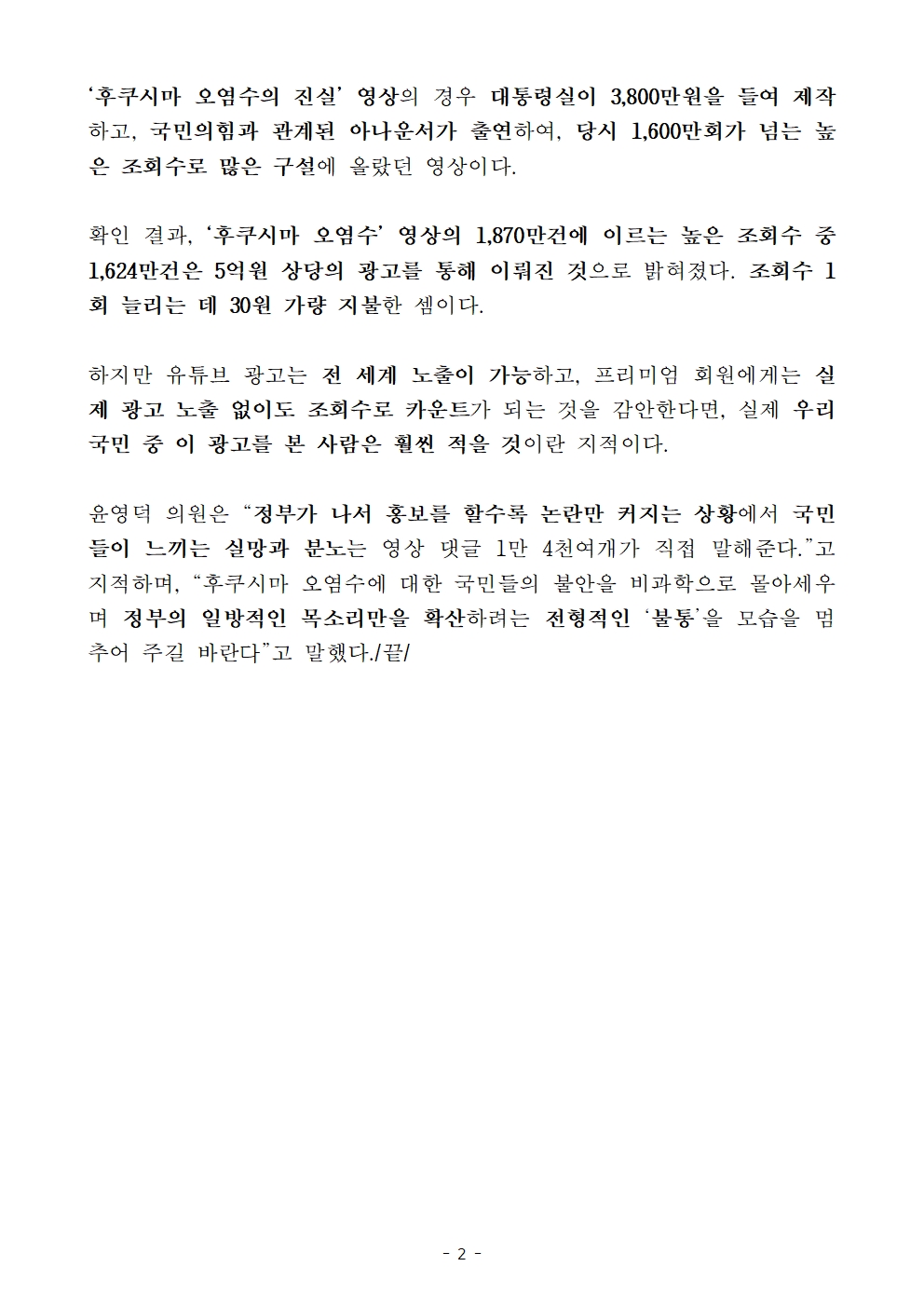 [윤영덕의원 국감 보도자료]정부‘후쿠시마 오염수의 진실’영상 1,869만 조회수 중 1,624만회가 광고로 충당