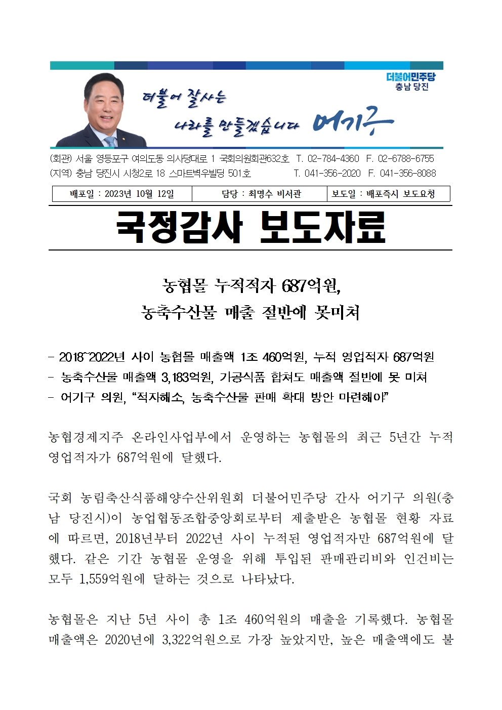 231012 [어기구의원 국정감사 보도자료] 농협몰 누적적자 687억원 농축수산물 매출 절반에 못미쳐.hwp