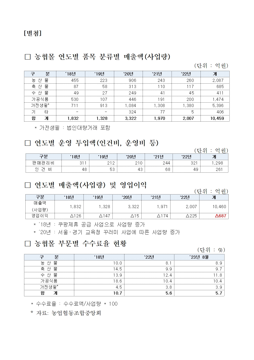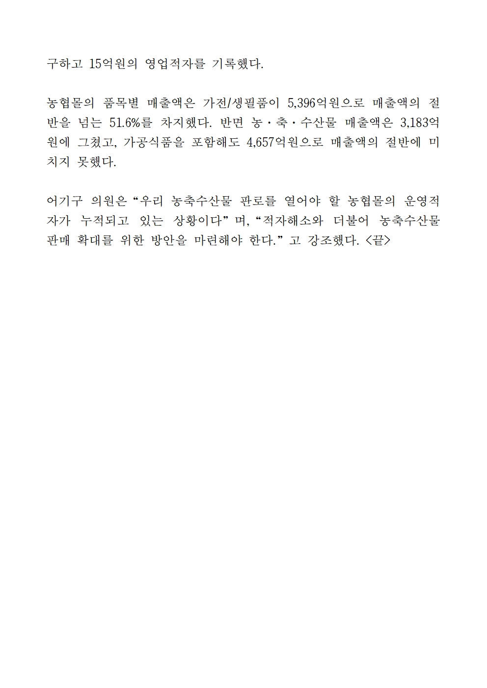 [어기구의원 국정감사 보도자료] 농협몰 누적적자 687억원, 농축수산물 매출 절반에 못미쳐