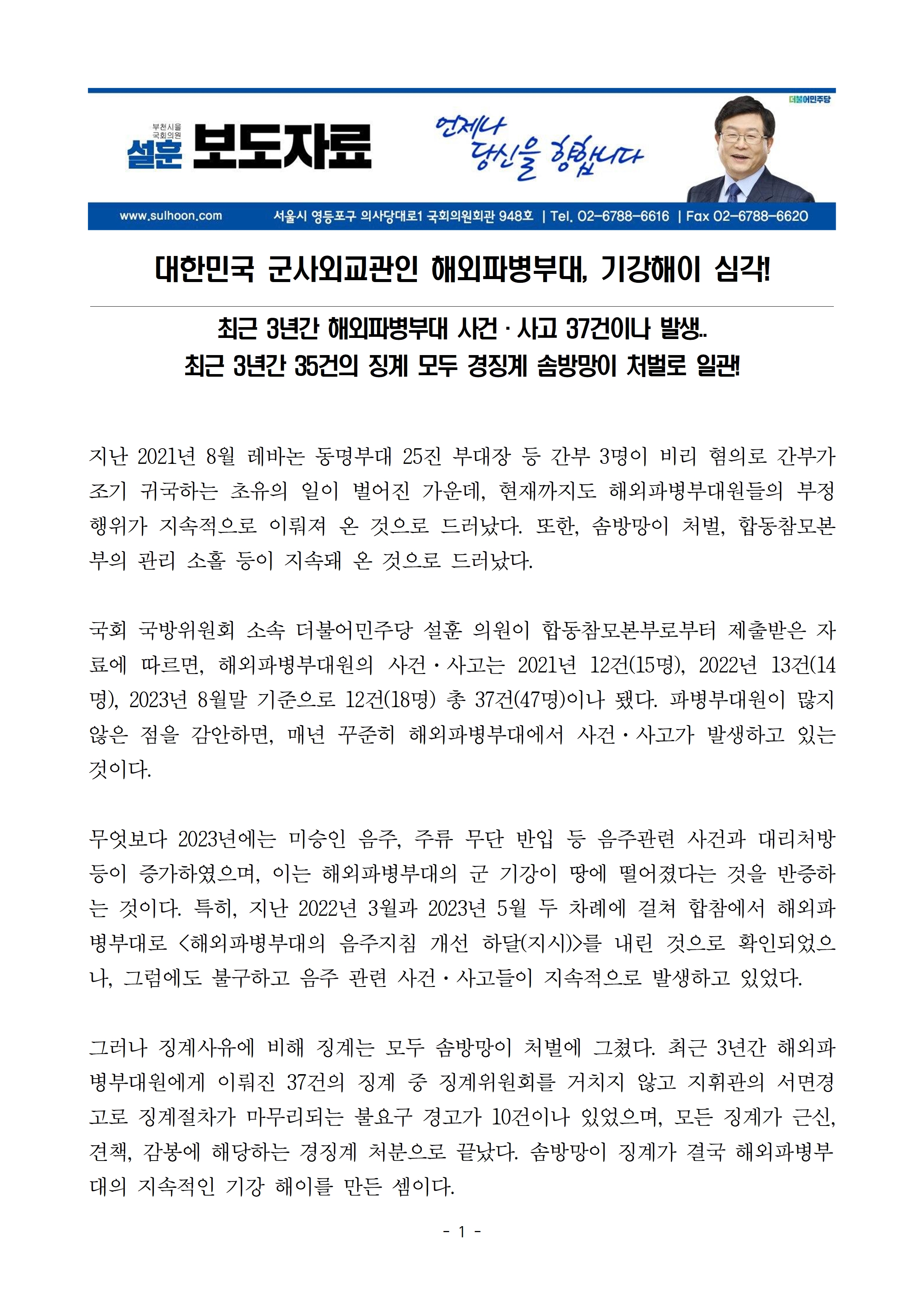 [국회의원 설훈 보도자료] 대한민국 군사외교관인 해외파병부대, 기강해이 심각!