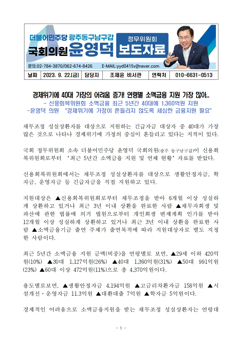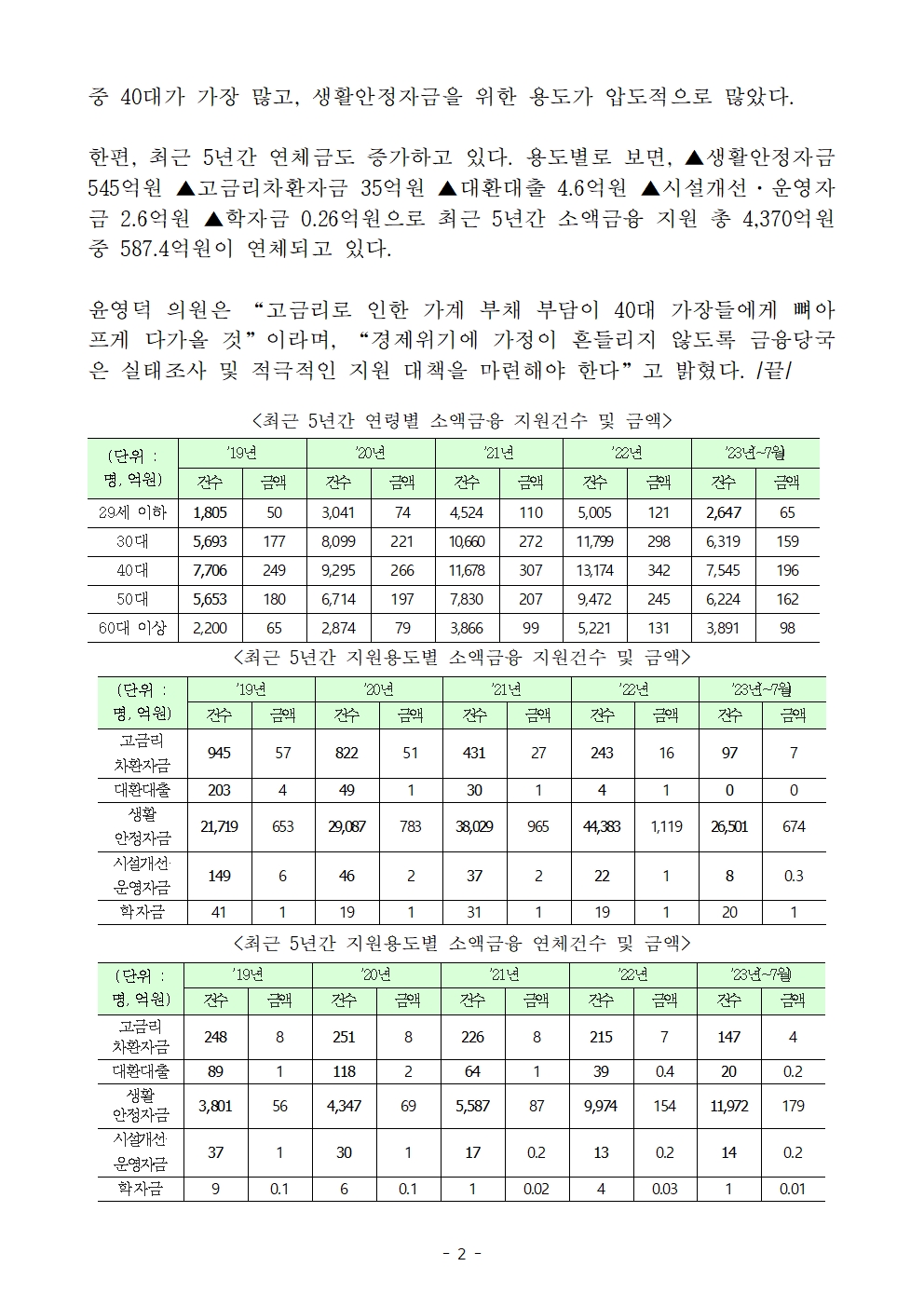 230922_윤영덕_보도자료_경제위기에_40대_가장의_어려움_증가!_연령별_소액금융_지원_가장_많아.hwp
